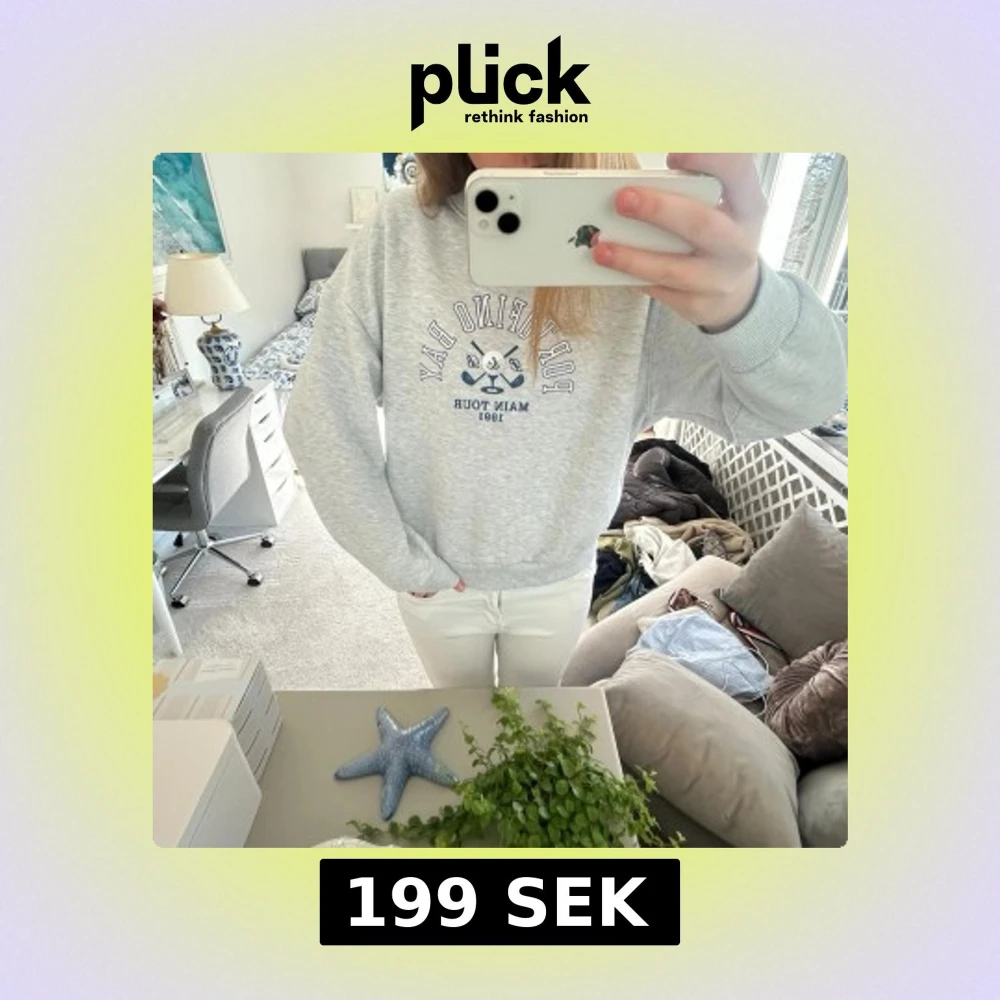 Säljer en ljusgrå sweatshirt med blått tryck framtill där det står 'Portland Bay Main Tour 1991' och två korsade åror. Tröjan har rund hals, ribbade muddar och avslappnad passform. Perfekt för en chill och sportig look. Passar S!