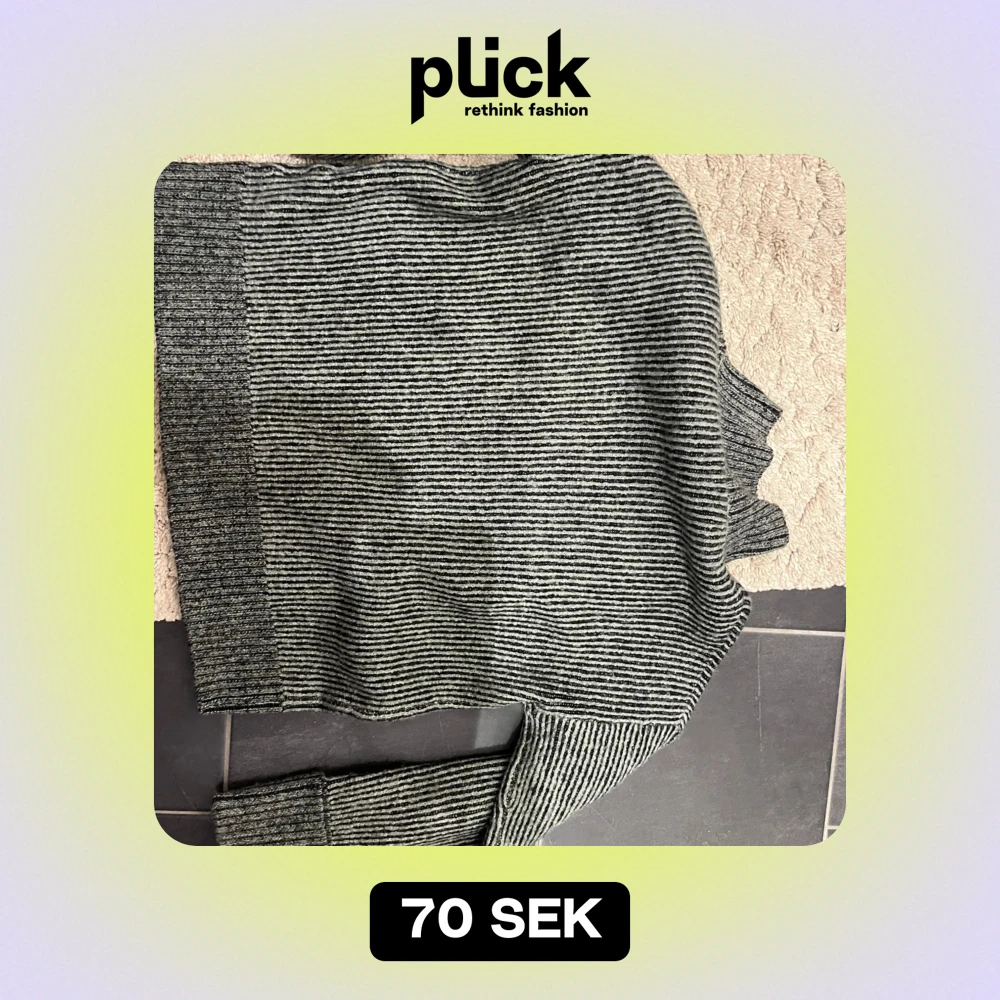 Säljer en supermysig grå och svart randig stickad tröja. Perfekt för kyliga dagar med sin höga krage och långa ärmar. Tröjan har en loose passform som gör den extra bekväm. Passar perfekt till både jeans och kjol!