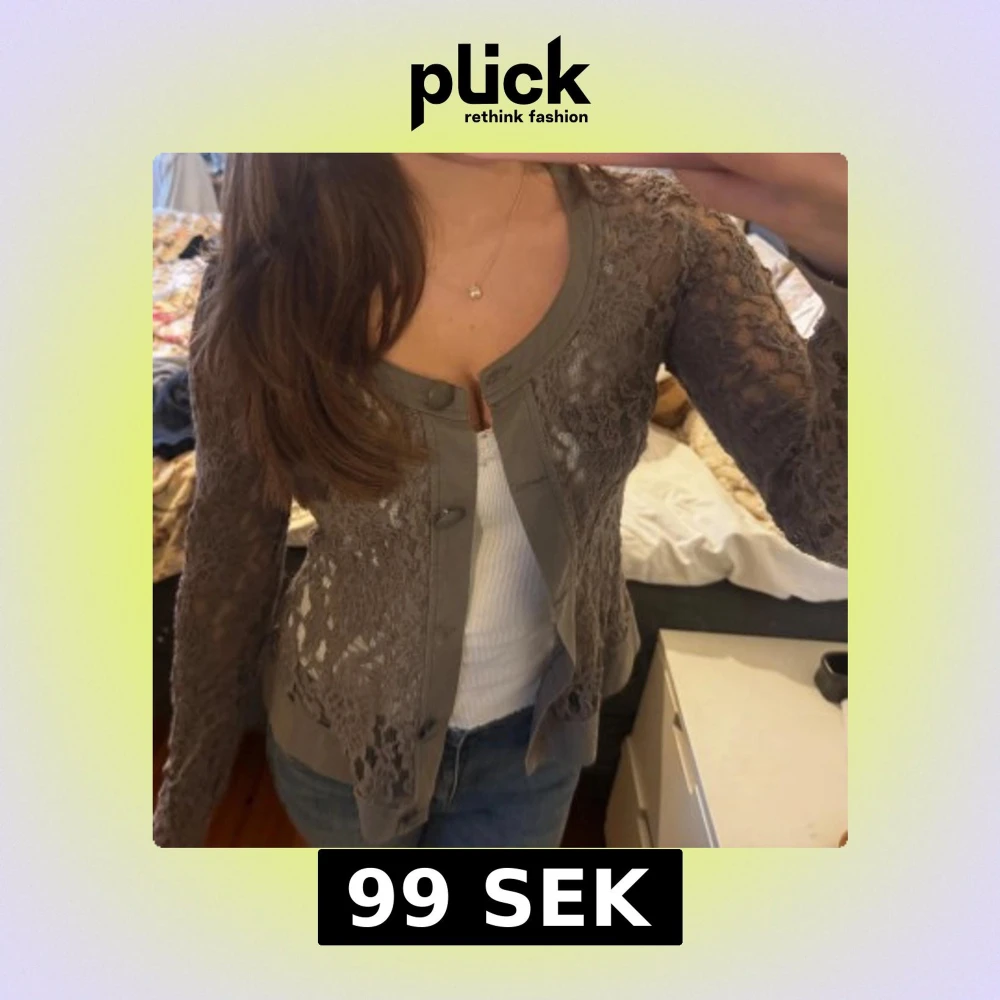 Supersnygg grå kofta med genombruten spets och stora knappar framtill. Koftan har långärmade ärmar och markerade kanter i tyg. Perfekt att slänga över ett linne eller t-shirt för en chill men ändå uppklädd look. Saknas 1 knapp men man lägger knappt märke till det