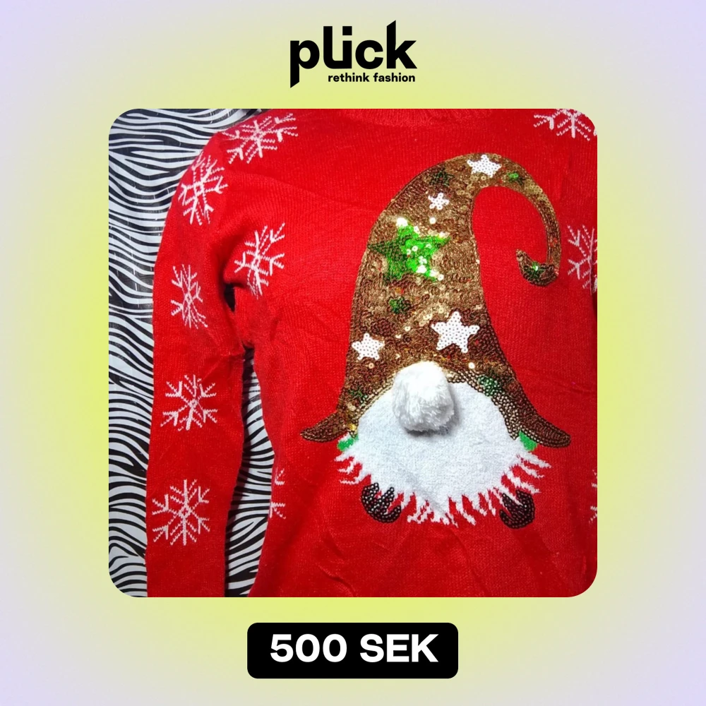 Säljer en supermysig röd jultröja med en glittrig tomteluva i paljetter och snöflingor över hela tröjan. Perfekt för julfesten eller mysiga vinterdagar. Tröjan har långa ärmar och är i bra skick. 🎅✨