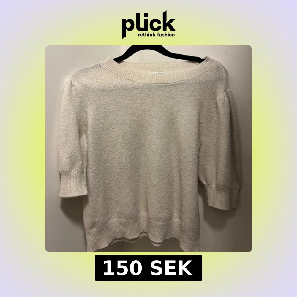 Mysig beige stickad tröja med bred ribbad halsringning och puffiga halvlånga ärmar.