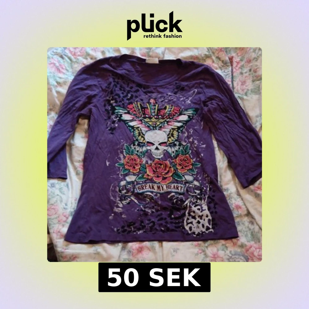 Cool lila topp från Avanti med trekvartsärm och stort färgglatt tryck framtill med döskalle, rosor, fjäril och krona. Texten 'Break My Heart' och leopardmönsterdetaljer gör den extra edgy. Tillverkad i mjuk bomull, perfekt för dig som gillar statement-plagg.