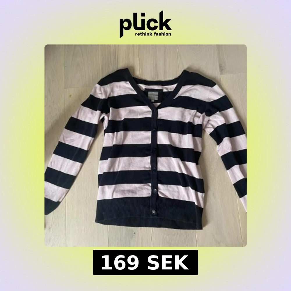 Säljer en kofta från Race Marine i svart och ljusrosa med breda ränder. Tröjan har långa ärmar, v-ringning och knäppning framtill med svarta knappar. Perfekt för lager-på-lager och enkel att matcha.