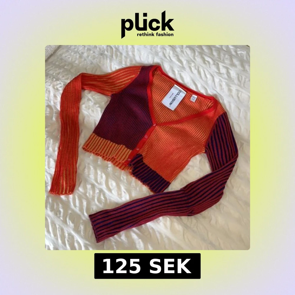 Säljer en croppad kofta från Collusion i röd, orange och mörkblå med gula detaljer. Tröjan är ribbstickad, har v-ringning, knappar framtill och långa ärmar.