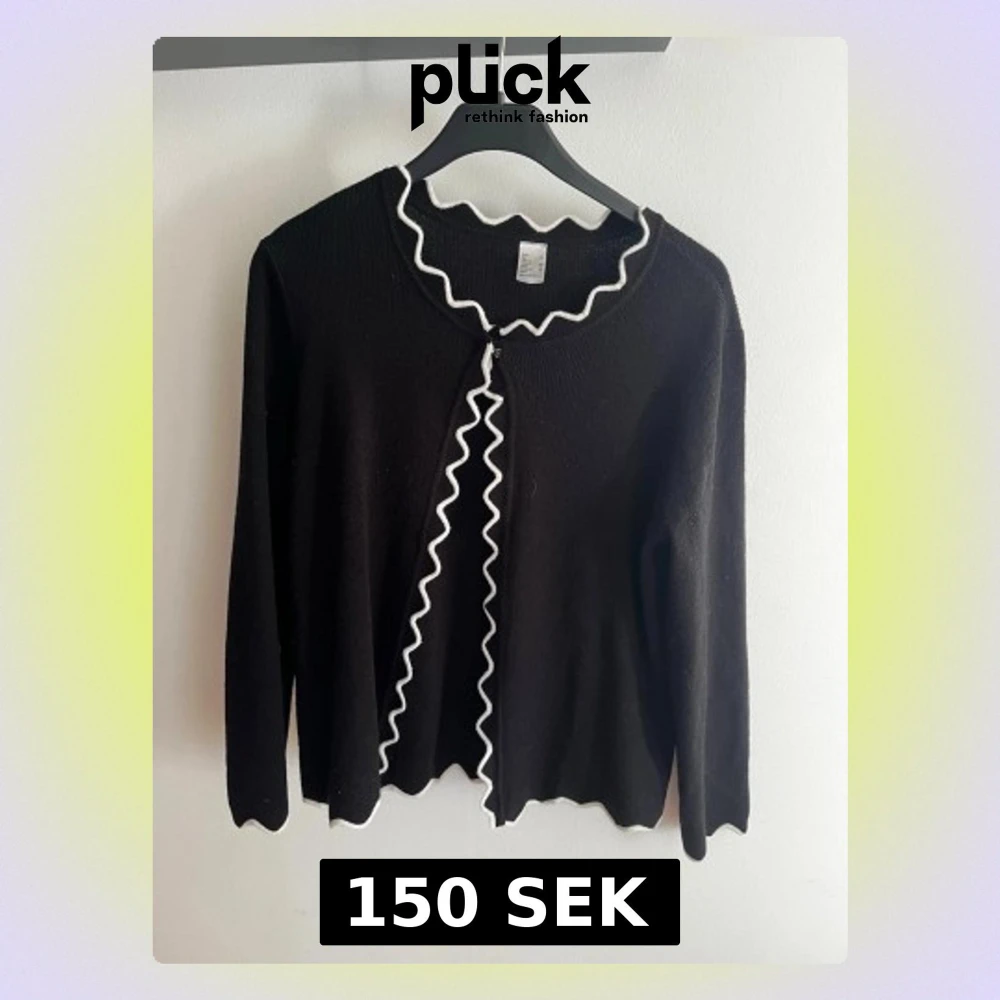 Snygg svart kofta med långa ärmar och vågiga vita kanter längs halsringning och öppning. Koftan har en öppen design med endast en knapp upptill och är tillverkad i ett mjukt stickat material. Perfekt för att addera en cool detalj till din outfit. Köpt begagnad men ej använd av mig.