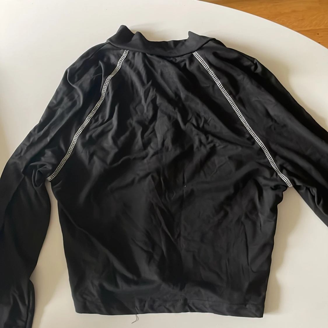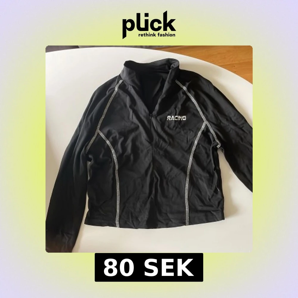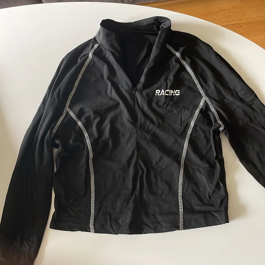 Svart långärmad tröja med vit dekorativ söm och texten 'RACING' på bröstet. Tröjan har en half zip-dragkedja framtill och sportig känsla, perfekt för dig som gillar en aktiv stil. Materialet känns som polyester och passformen är normal.