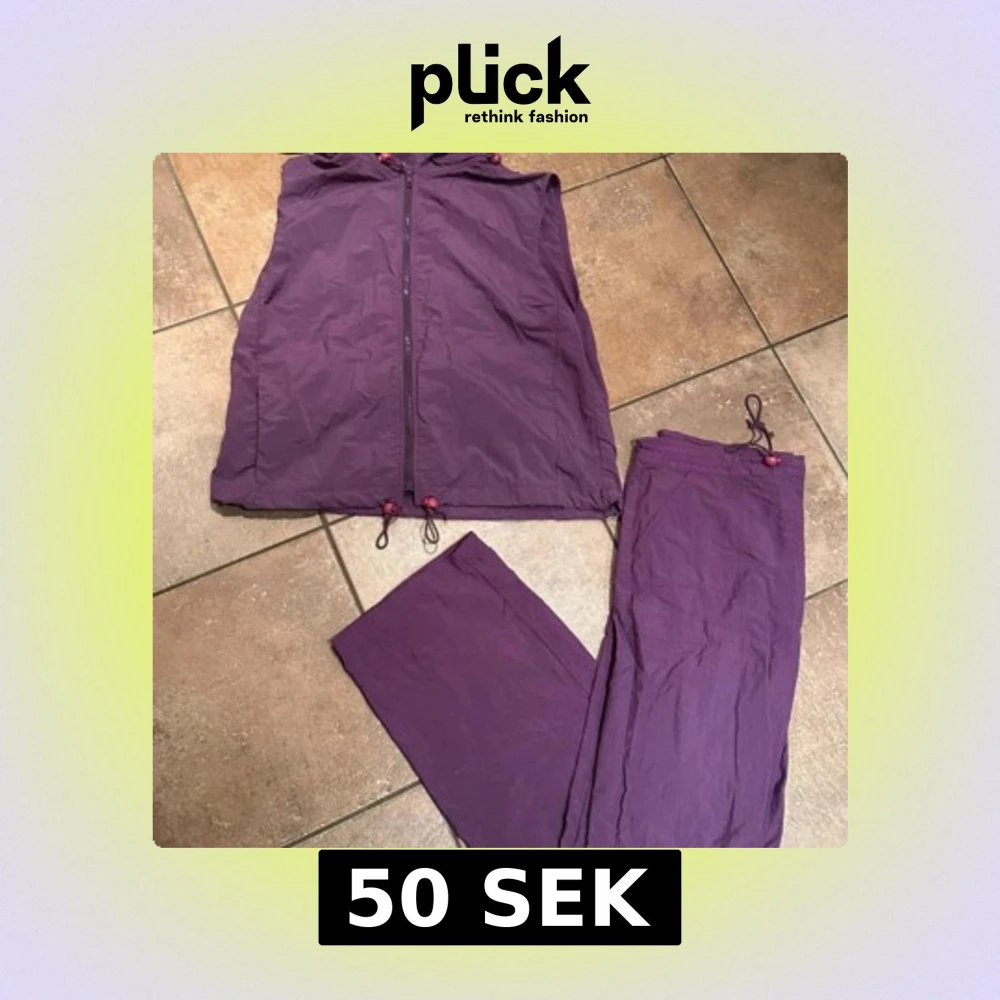 Säljer en lila sett. Jackan har dragkedja och huva. Byxorna har en enkel design med dragsko i midjan.