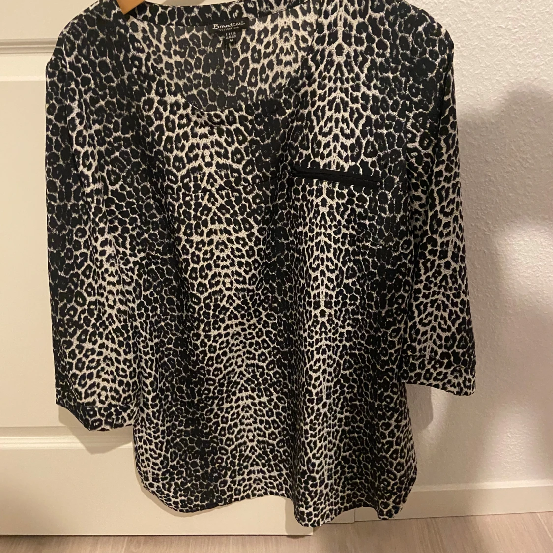 Säljer en leopardmönstrad tröja från Brandtex med trekvartsärmar och en praktisk dragkedja framtill. Perfekt för att ge din outfit en djärv touch. 🐆