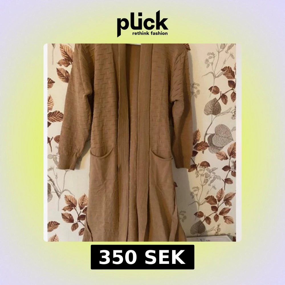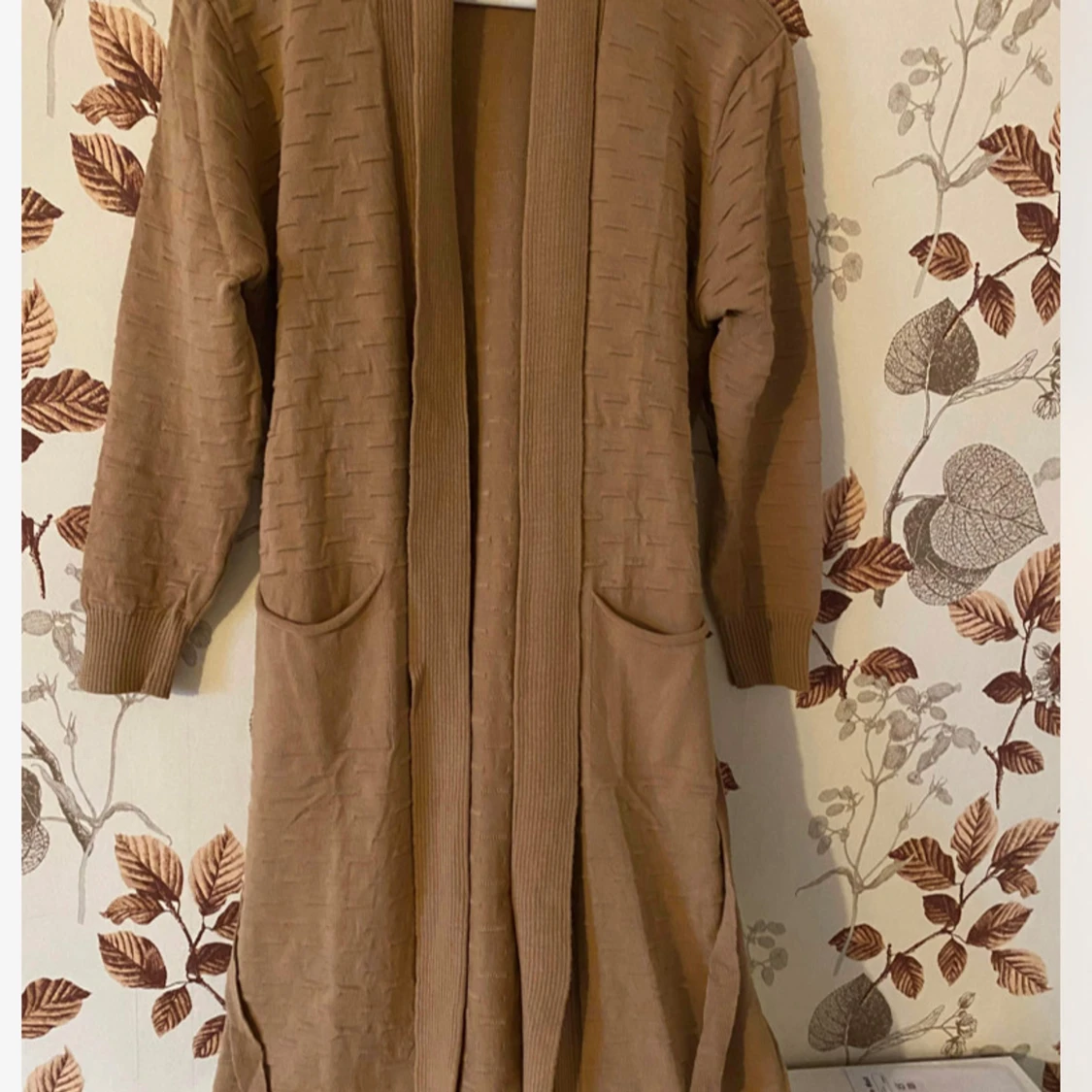 Lång beige kofta med snyggt stickat mönster och två stora fickor framtill. Koftan har ribbade muddar och bred ribbad kant längs öppningen. Perfekt att slänga på sig över en t-shirt eller topp för en chill look.
