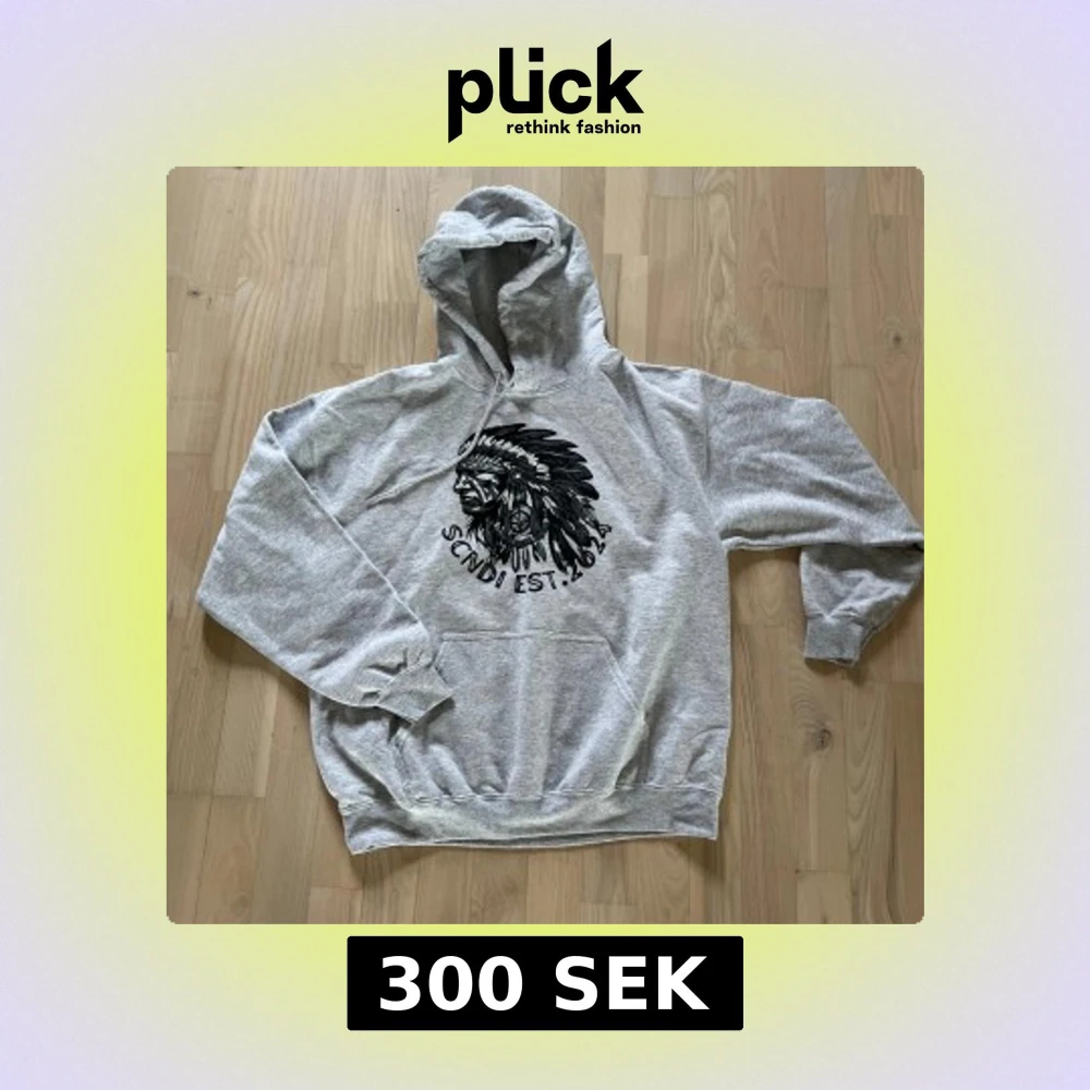 Säljer en grå hoodie från SCNDI med stort svart tryck av en indianhövding och texten 'SCNDI EST. 2024' på bröstet. Tröjan har huva och magficka, samt ribbade muddar vid ärmslut och nederkant. Storlek L