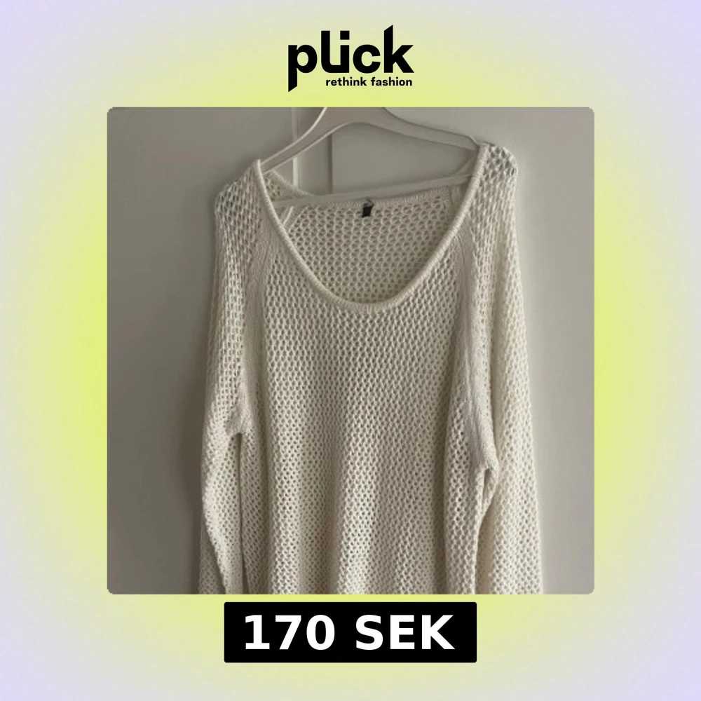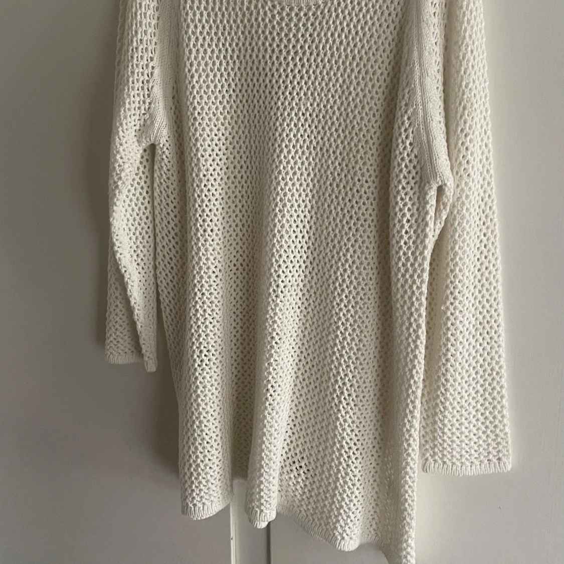 Säljer en vit stickad tröja med grovt nätmönster och rund halsringning. Tröjan har lång ärm och en loose passform, perfekt att slänga på sig över ett linne eller t-shirt. Enkel och stilren design som funkar året runt.