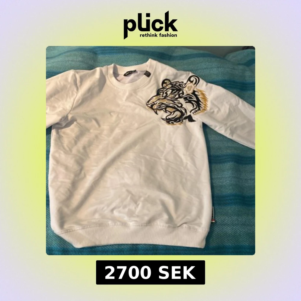 Säljer en vit sweatshirt från Philipp Plein med ett stort broderat tigermotiv i svart och gult på bröstet. Tröjan har rund halsringning och långa ärmar. Perfekt för dig som vill sticka ut med en unik detalj.