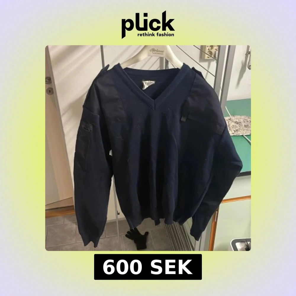 Säljer en mörkblå tröja med v-ringning och långa ärmar. Tröjan har en enkel design med ribbade muddar vid ärmslut och nederkant. Perfekt för en avslappnad stil.