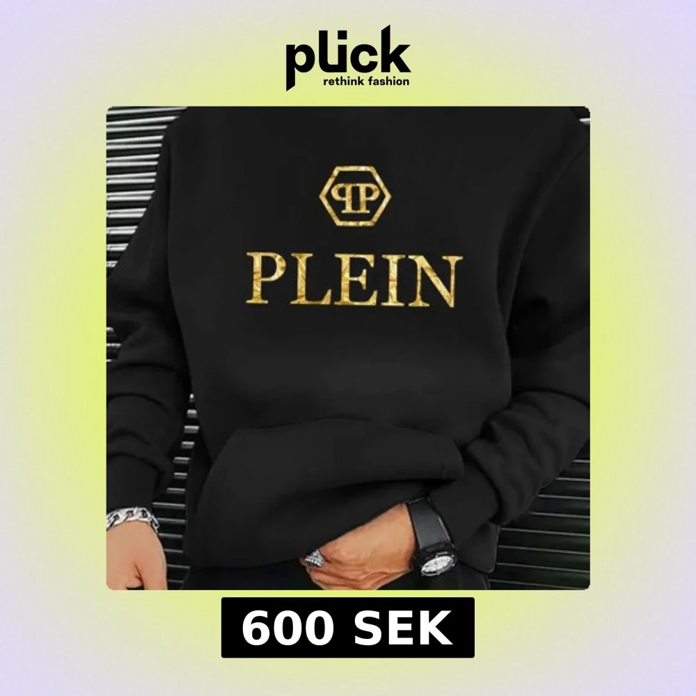 Snygg svart hoodie från Plein med guldfärgad logga på bröstet. Perfekt för en stilren look med en touch av lyx. Den har en klassisk huva med dragsko och långa ärmar. Storlek L