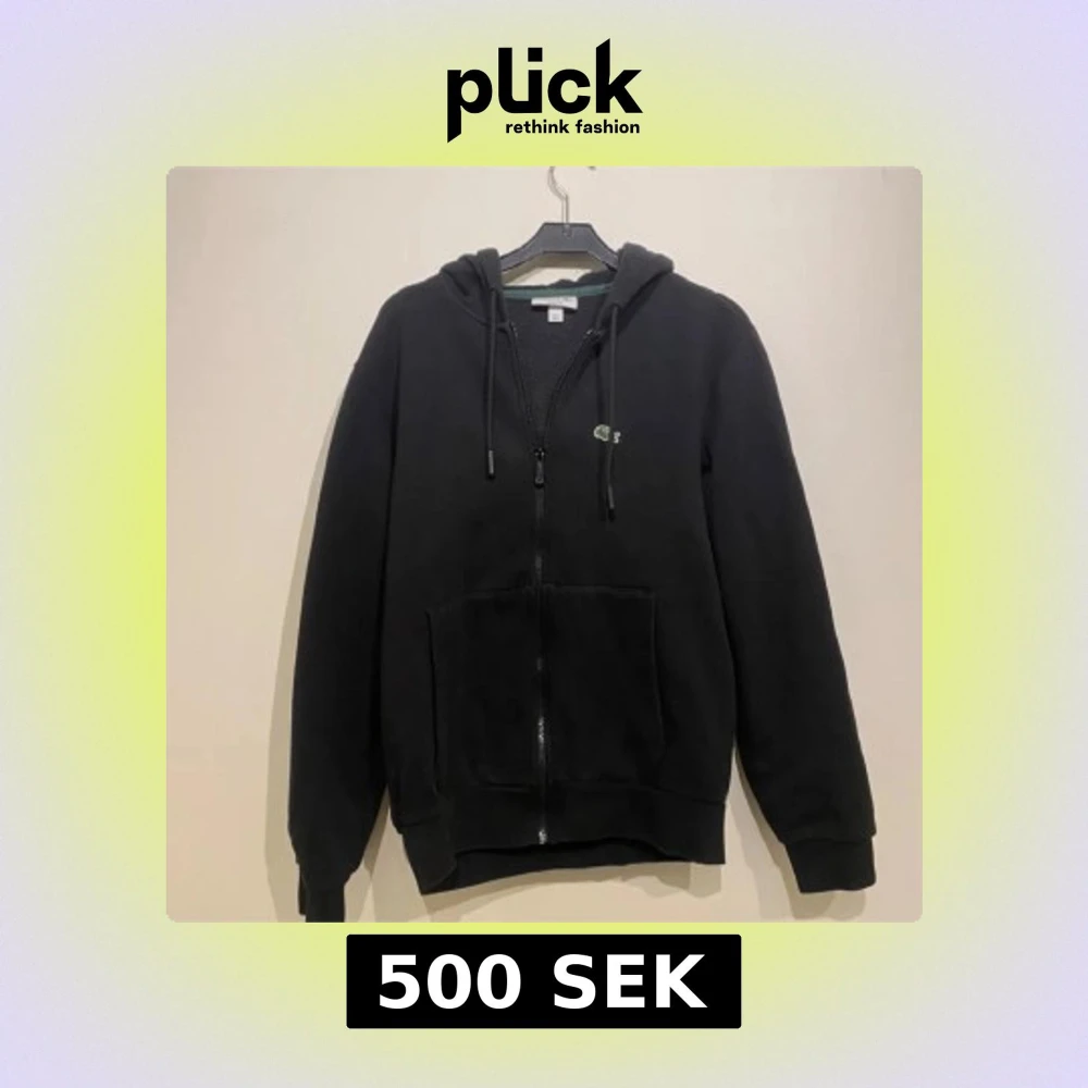 Säljer en klassisk svart hoodie från Lacoste med dragkedja och huva. Tröjan har långa ärmar. Perfekt för en avslappnad stil. Nypris 1400 kr