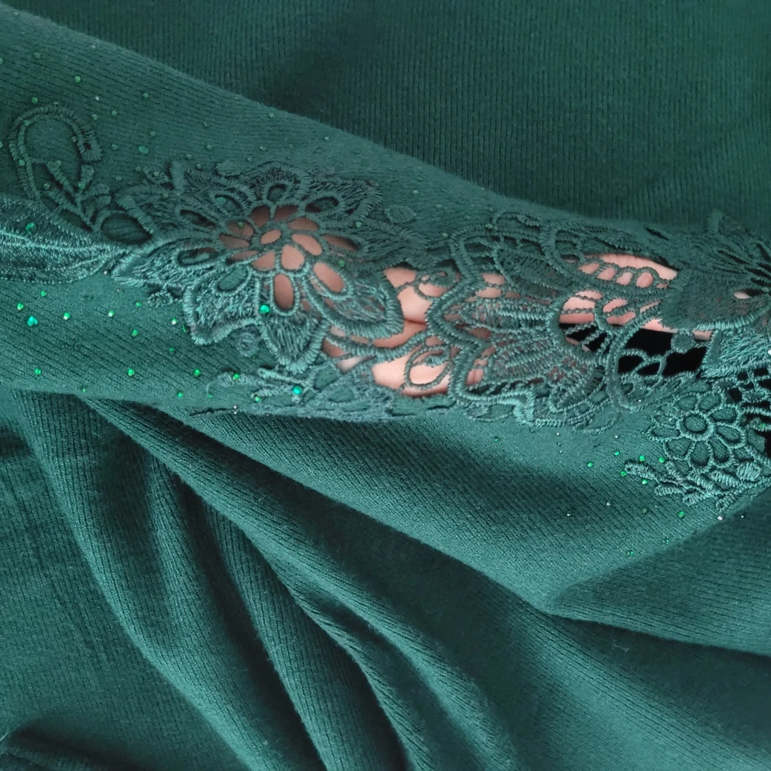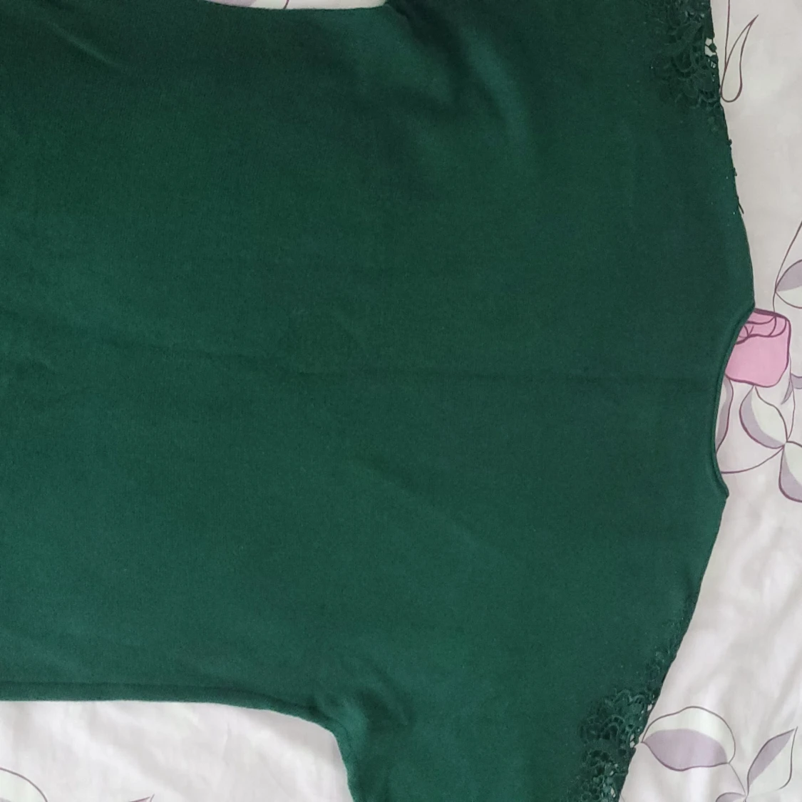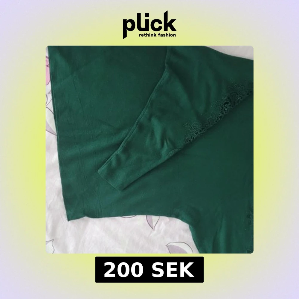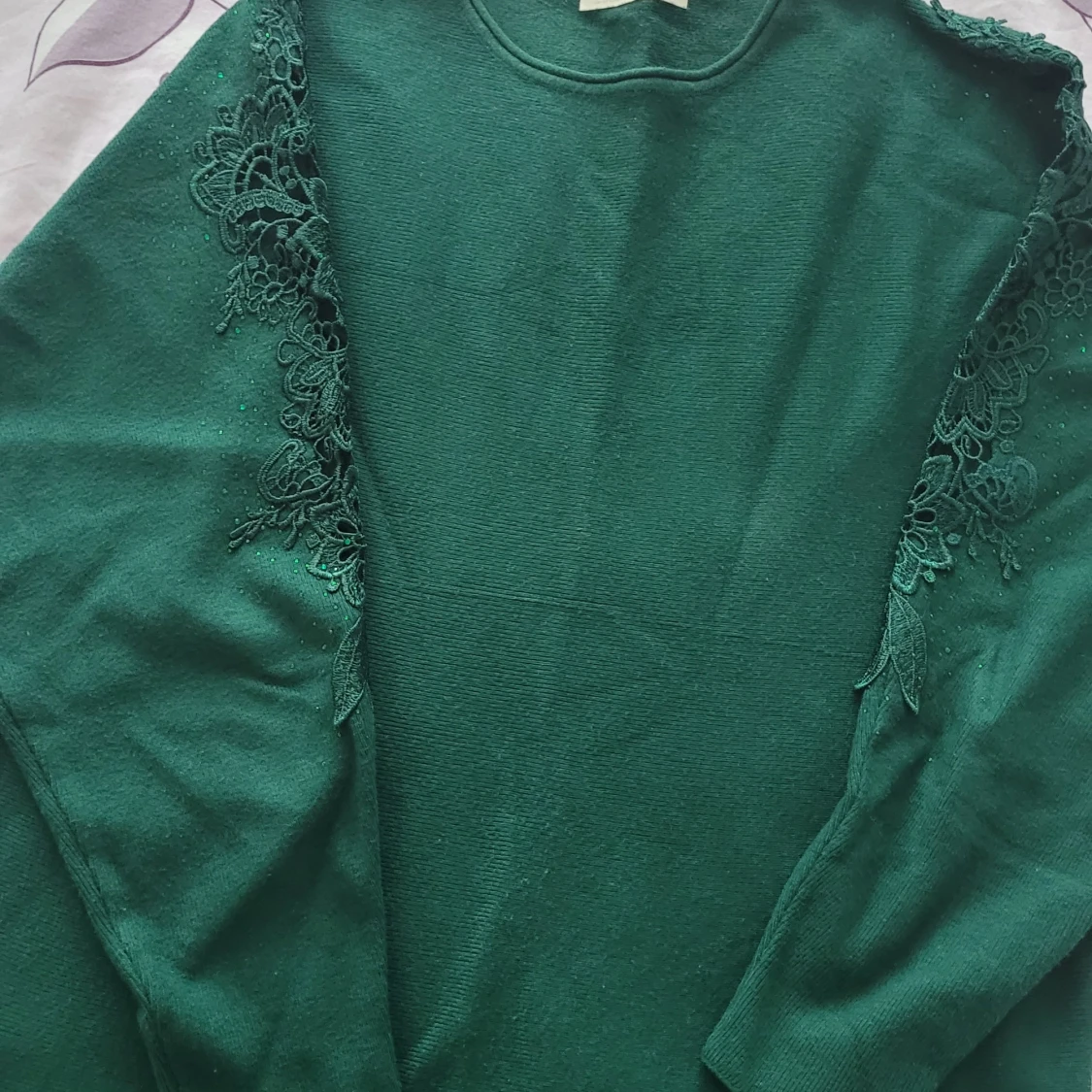 Säljer en elegant cashmere blandat grön tröja från AnFaiya med vackra spetsdetaljer längs ärmarna. Tröjan har en normal passform och är perfekt för att ge en stilfull touch till din garderob. Passar bra till både vardag och speciella tillfällen.