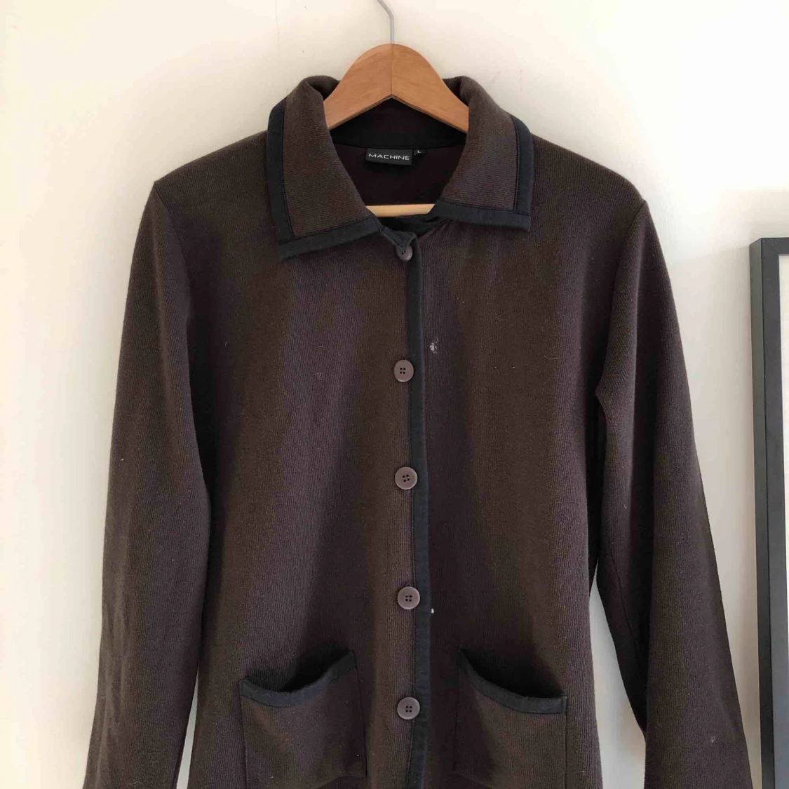 Kofta med krage, knappar och fickor! Kan användas som tunn jacka under sommaren. Mörk brun med markerade kanter Storlek L men funkar till mindre, beroende på hur man önskar passformen