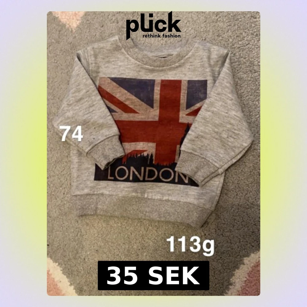 Grå sweatshirt med stort tryck av brittiska flaggan och texten 'London' framtill. Tröjan har ribbade muddar vid ärmslut och nederkant samt rund hals. Perfekt för dig som gillar coola prints och streetstyle.🌸 Fint använt skick. Storlek 74