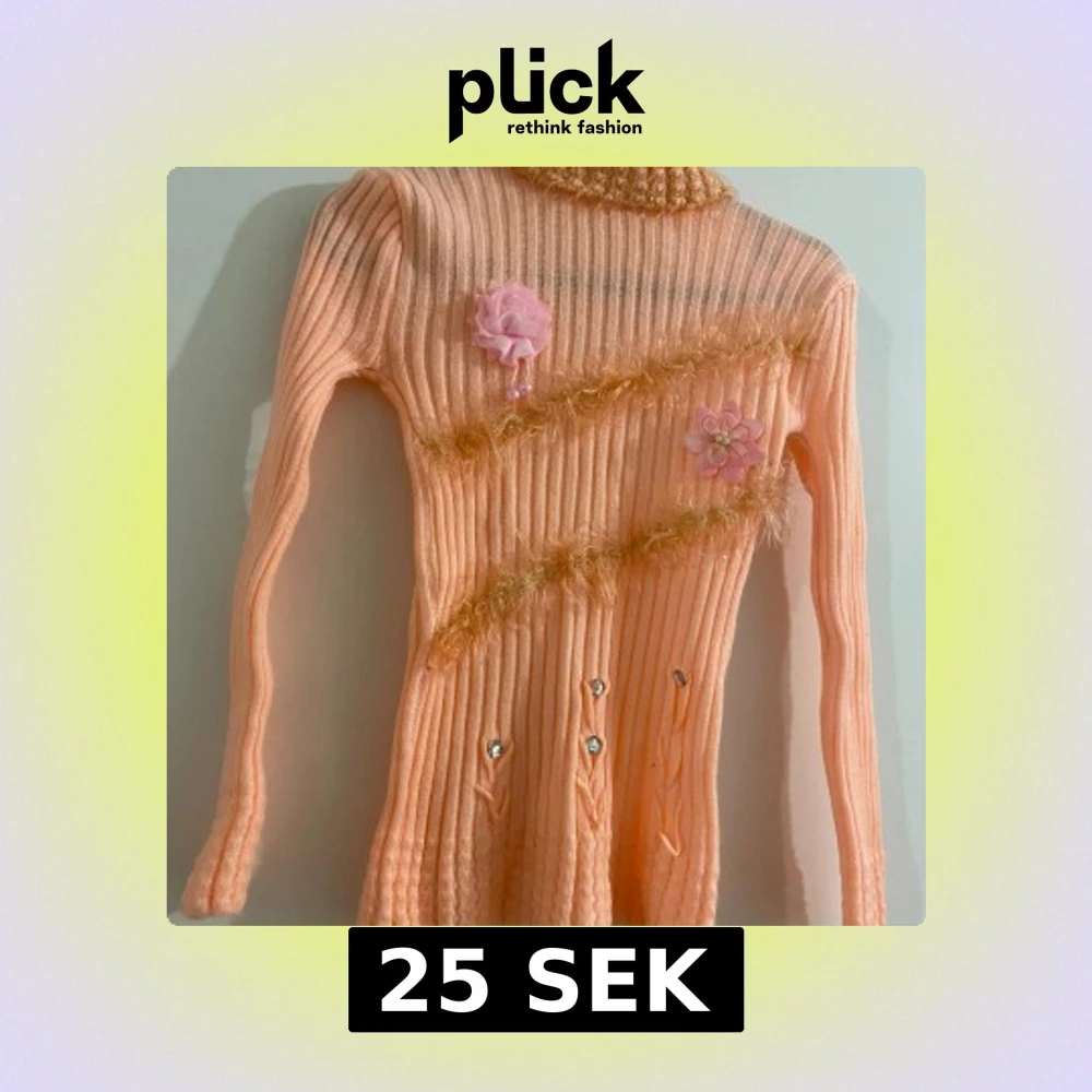 Säljer en ljus orange ribbad polotröja med lång ärm och hög krage. Tröjan har dekorativa blommor i rosa och pärldetaljer framtill samt fluffiga guldfärgade ränder. Materialet är stickat och ger en mysig känsla. Perfekt för dig som gillar unika detaljer och färg.