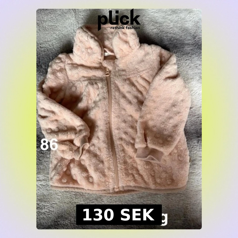 Supermjuk ljusrosa fleecejacka med huva och dragkedja framtill. Jackan har ett bubbligt strukturmönster och ribbade muddar vid ärmsluten. Perfekt för kyliga dagar och enkel att dra på över andra kläder.🌸 Fint använt skick. Storlek 86