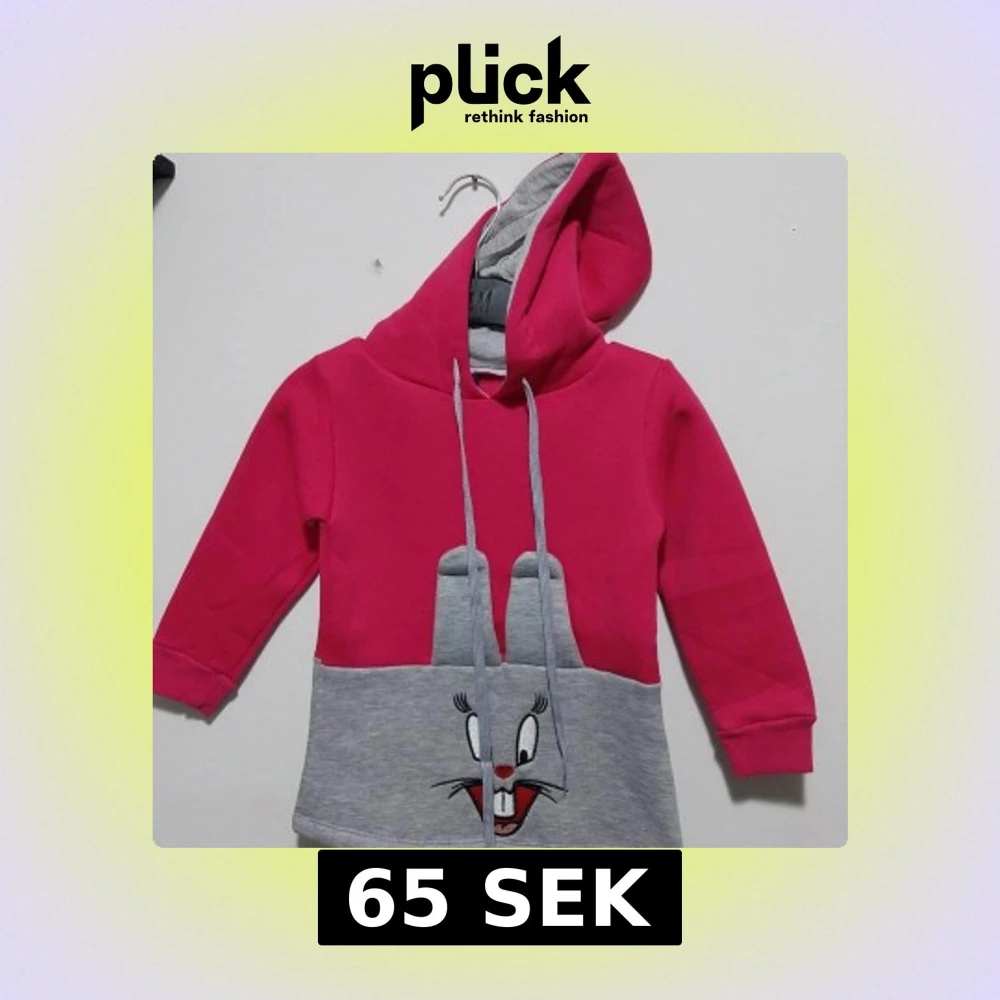 Säljer en söt rosa och grå hoodie med ett kaninmotiv framtill. Hoodien har långa ärmar och en praktisk huva. Perfekt för en avslappnad stil.