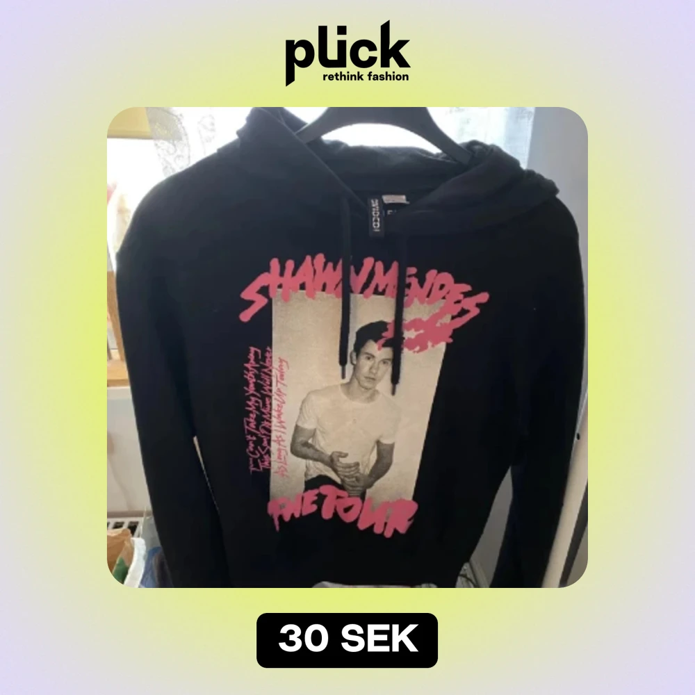 En svart hoodie med ett tryck av Shawn Mendes på framsidan. Hoodien har en justerbar huva med dragsko och långa ärmar.