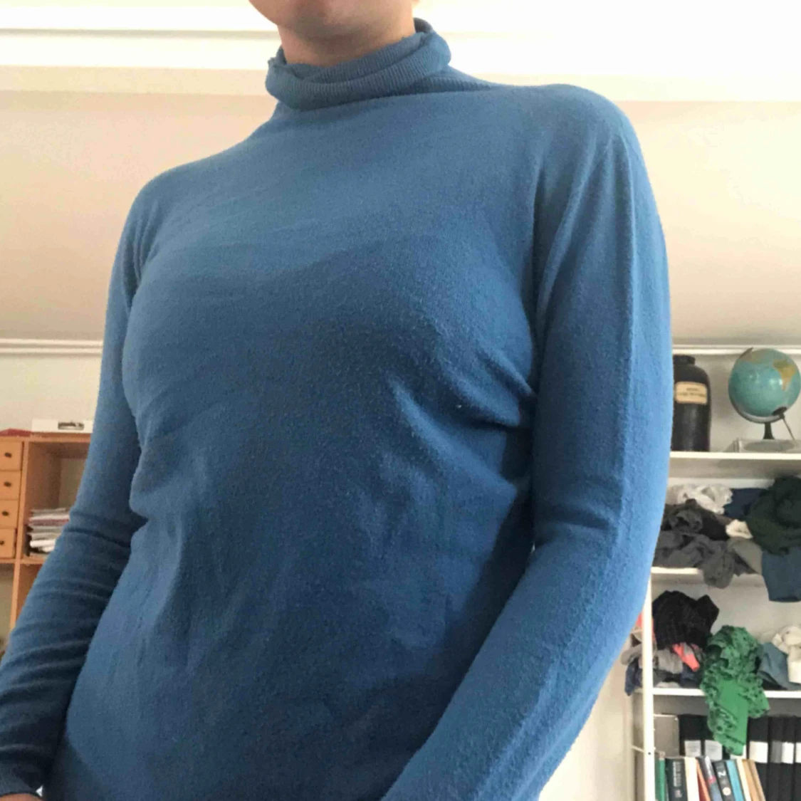 Ljusblå polotröja. Vet inte var den kommer ifrån eller vilken storlek då lappen är borta men den är stetchig så den passar alla mellan XS-M skulle jag säga.
