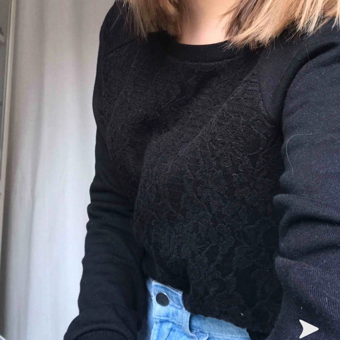 Svart långärmad tröja med spetsmönster på framsidan. Superskön och har använt väldigt sällan så skicket är på topp! Köparen står för frakt på ca 50kr🥰