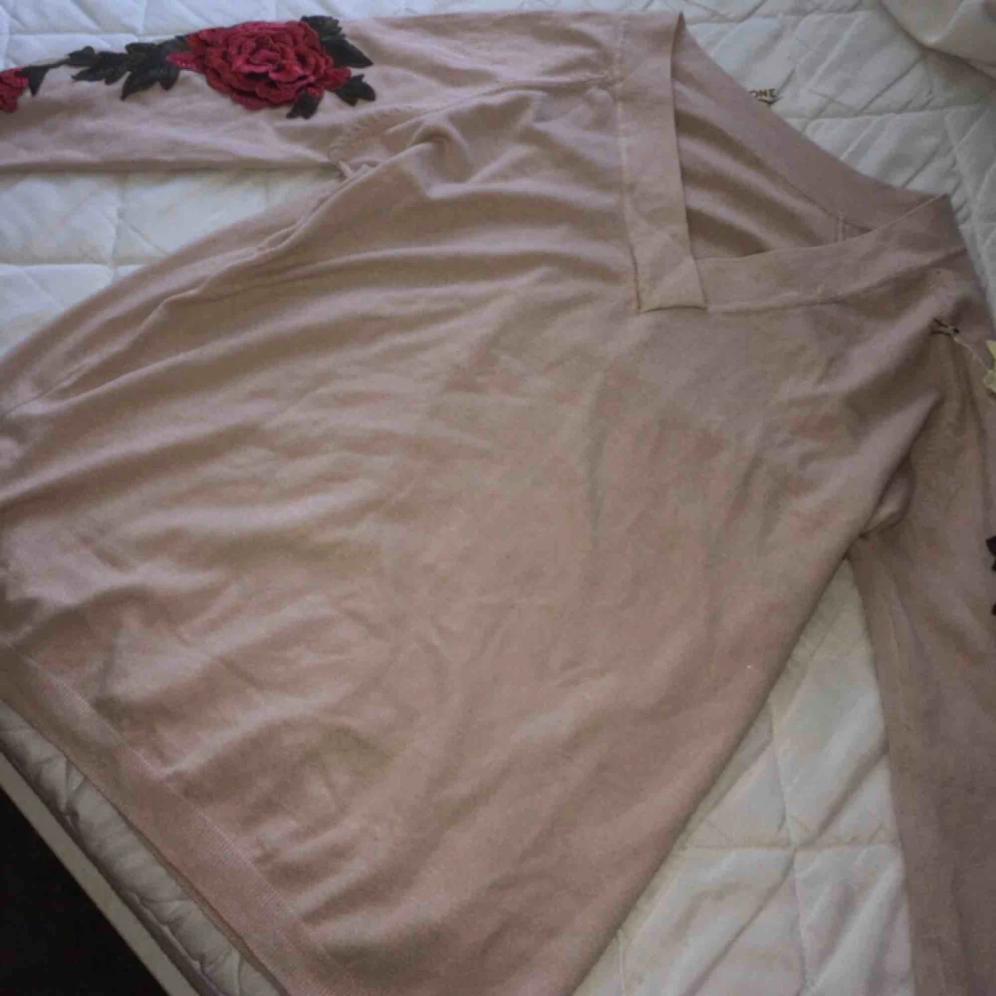 Superskön och mysig tröja med två fina rosor på armarnas sidor. Oanvänd! Passar mig som är SMALL/XS, och skulle även passa en Medium. •Köparen står för frakt!