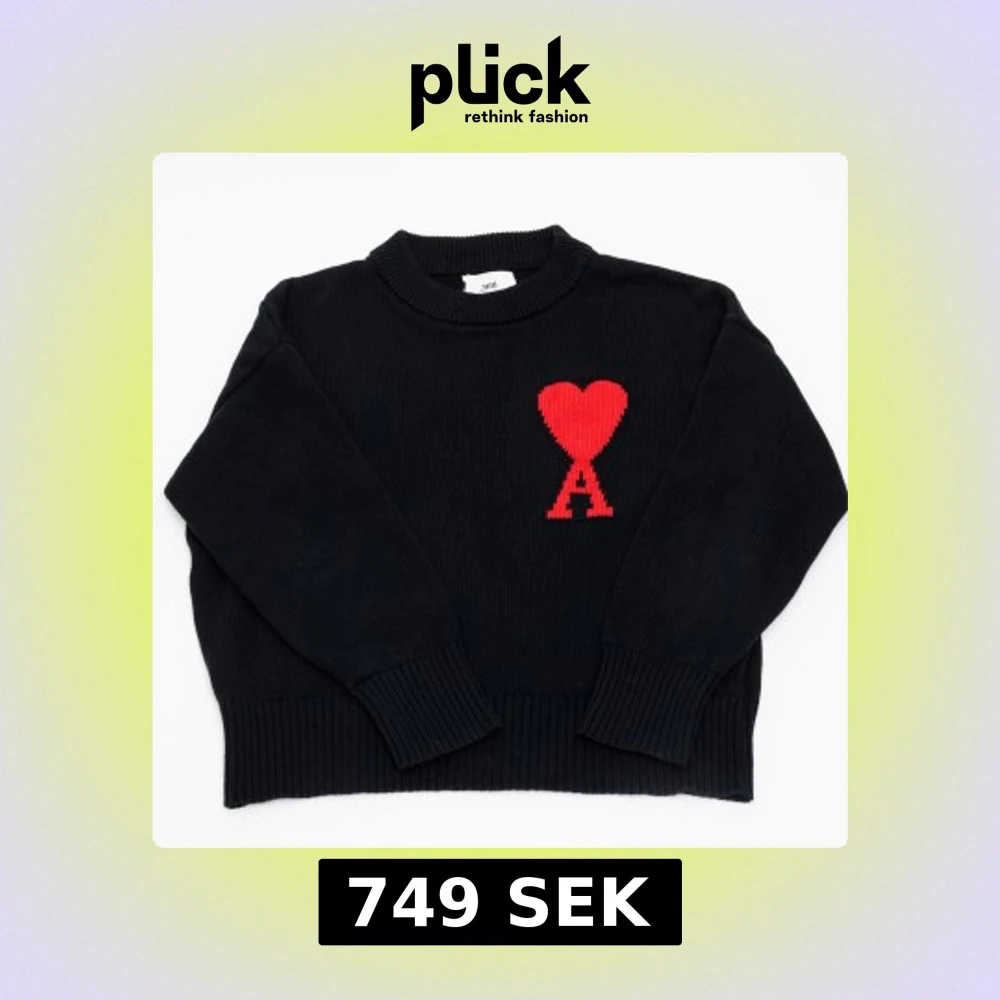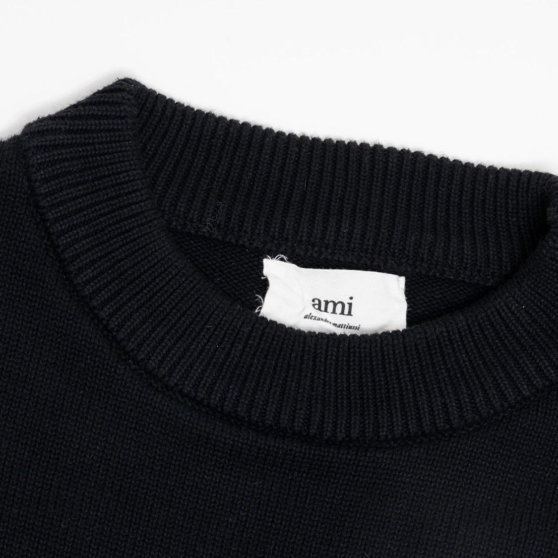 Svart stickad tröja från Ami Paris med rund halsringning och ett rött hjärta med bokstaven A broderat på bröstet. Tröjan har långa ärmar och breda ribbade muddar vid ärmslut och nederkant. Perfekt för dig som gillar stilrena detaljer med en twist. Det finns ett litet streck precis ovanför loggan som syns vid noga inspektion.