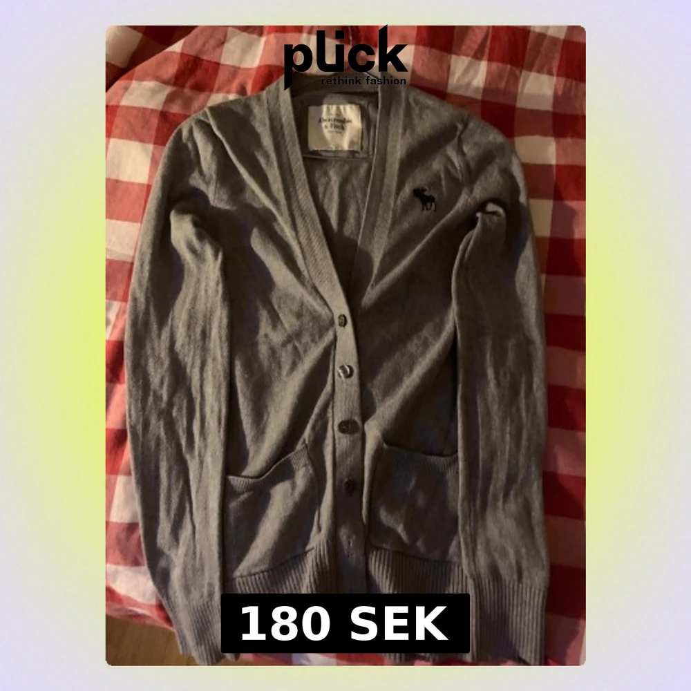 Klassisk grå kofta från Abercrombie & Fitch med v-ringning, knappar framtill och två fickor. Liten mörkblå logga med älg broderad på bröstet. Tillverkad i mjuk bomullsmix och har ribbade muddar vid ärmslut och nederkant. Perfekt för lager på lager under höst och vår. Sjukt gulligt vintage-plagg nu till vintern/hösten ❄️ 🍂 🍁