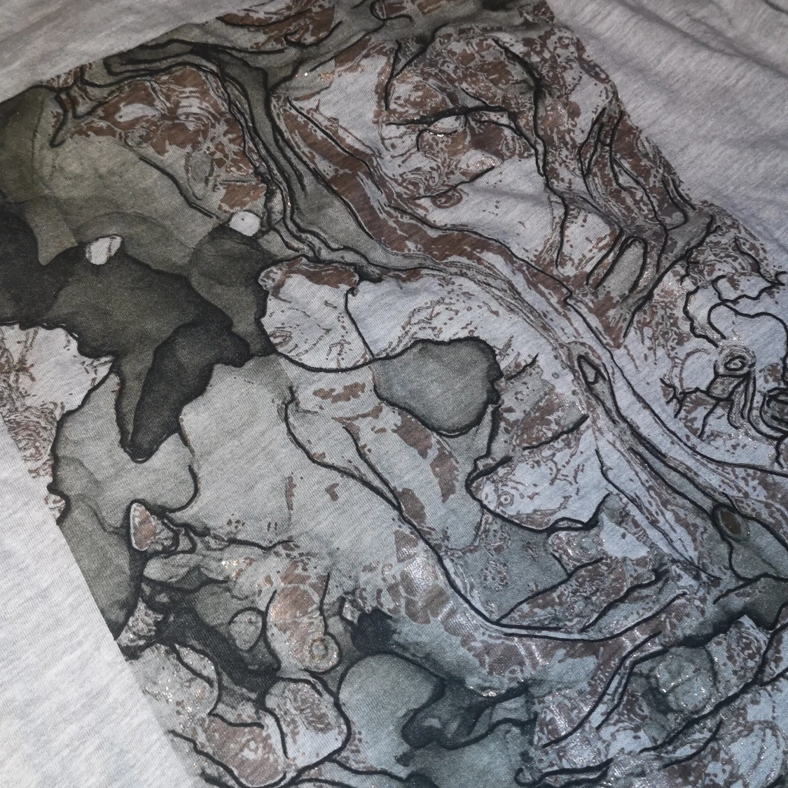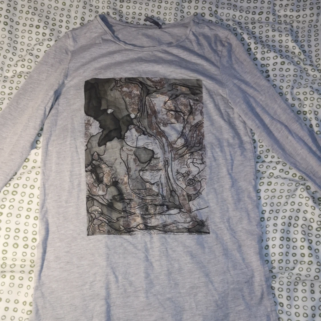 Grå tröja med abstrakt tryck. Strl s, den är ganska lång dock men sitter bra på kroppen, använd men bra skick
