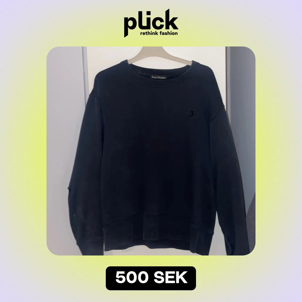 Säljer en svart tröja från Acne Studios med deras ikoniska ansiktsmärke på bröstet. Tröjan har långa ärmar och en liten reva på ena ärmen. Tröjan har även några vita prickar/fläckar. Går nog bort i tvätten.