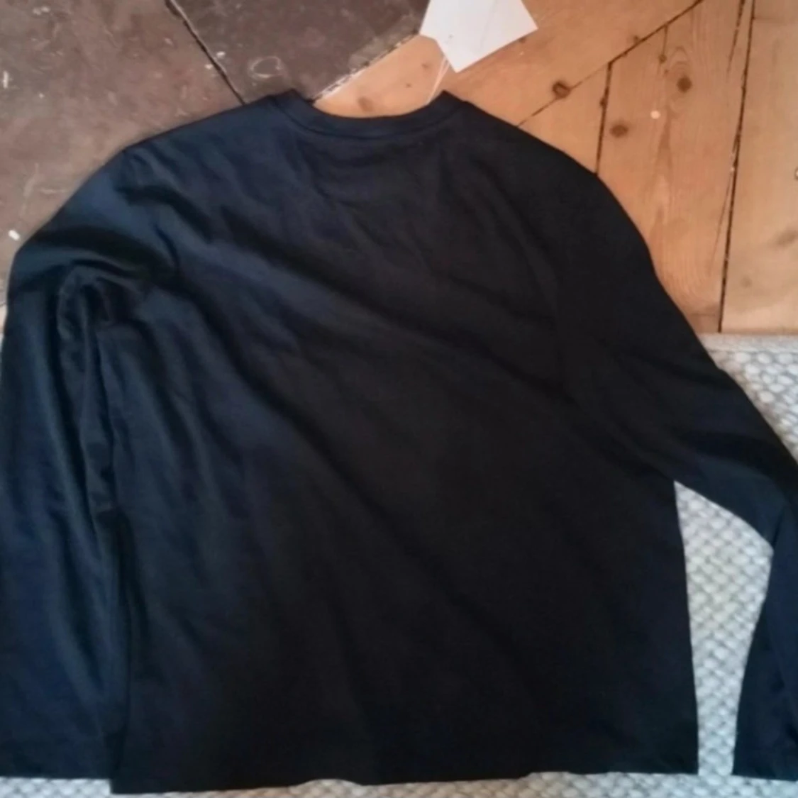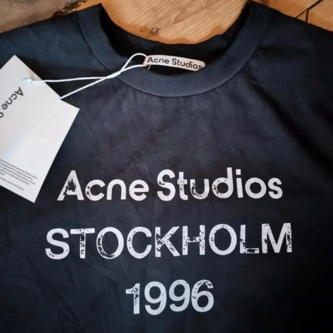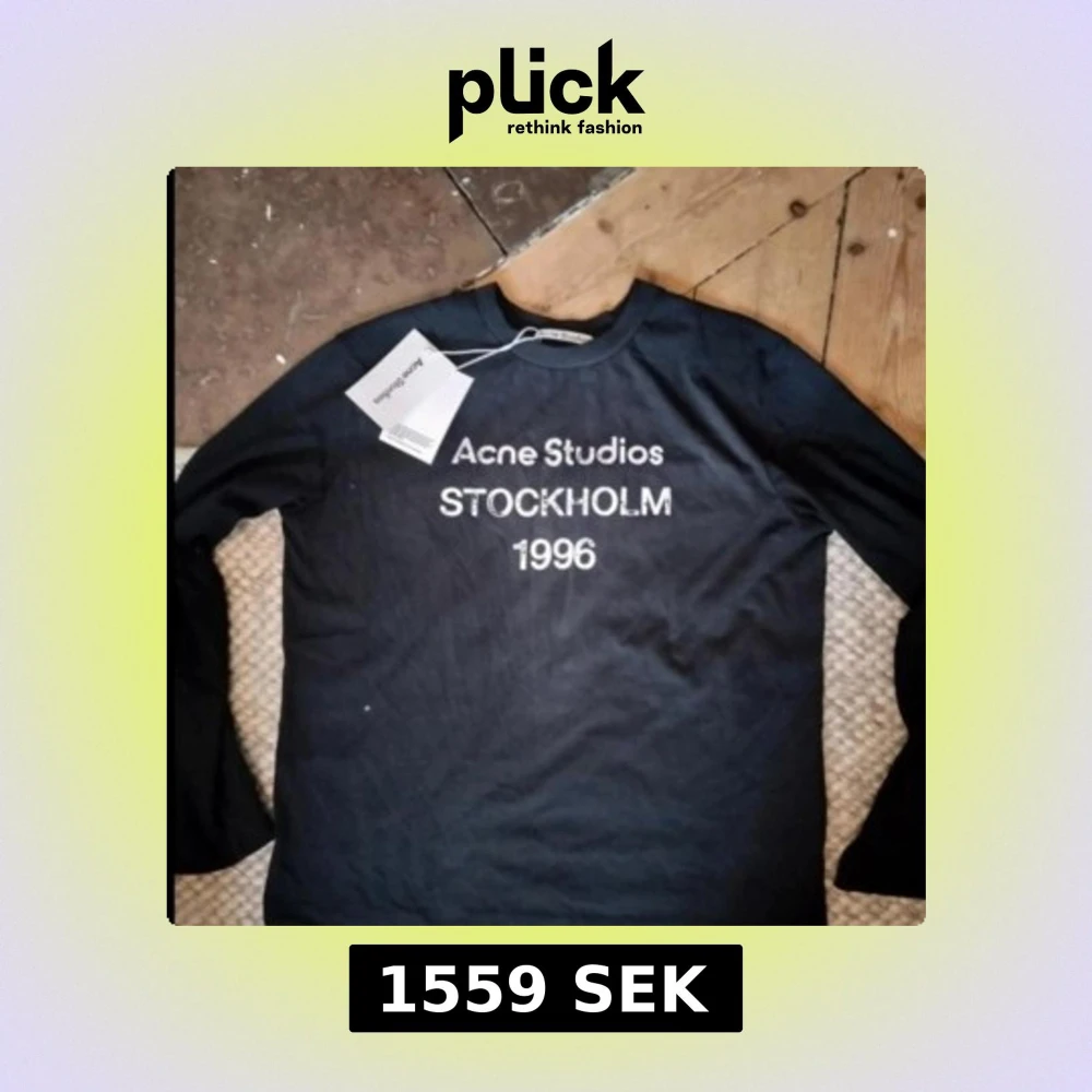 Svart långärmad tröja från Acne Studios med vit text 'STOCKHOLM 1996' på bröstet. Enkel och stilren design, perfekt för dig som gillar klassiska streetwear-plagg med tydlig logga. Rund hals och mjukt bomullsmaterial. S men passar M också stor i storlek