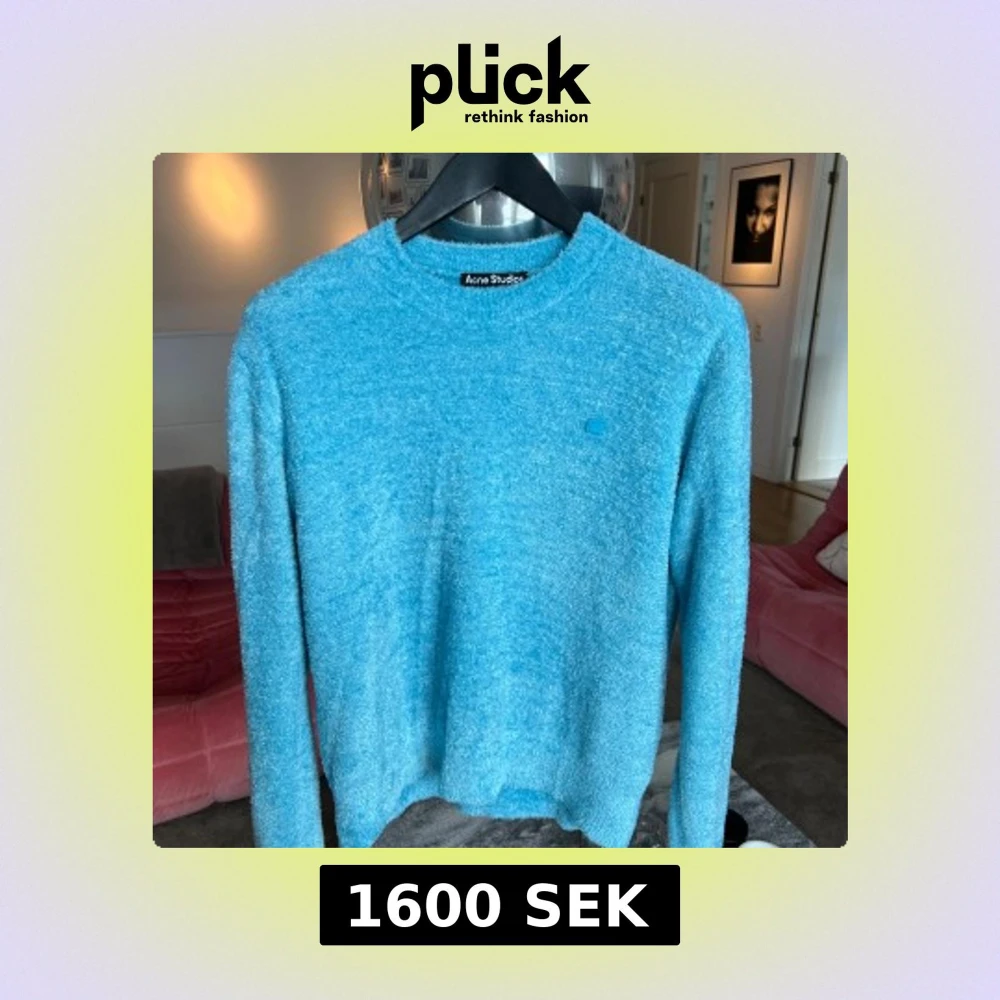 Nästan aldrig använd! Passar storlek Small. Supermjuk och fluffig blå tröja från Acne Studios med rund hals och diskret logopatch på bröstet. Långärmad och i en chill loose fit, perfekt för lager-på-lager. Materialet känns lyxigt och cozy.