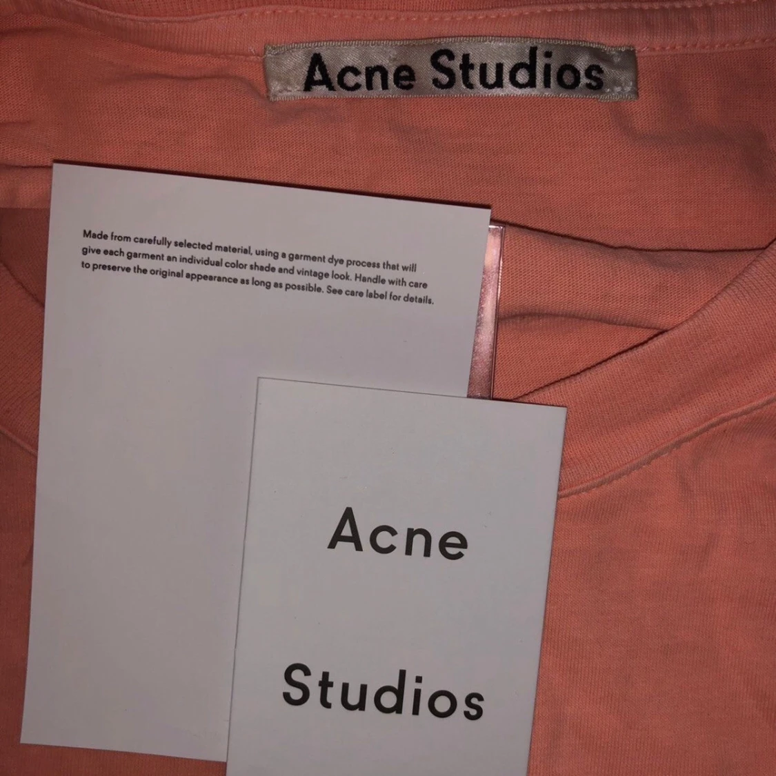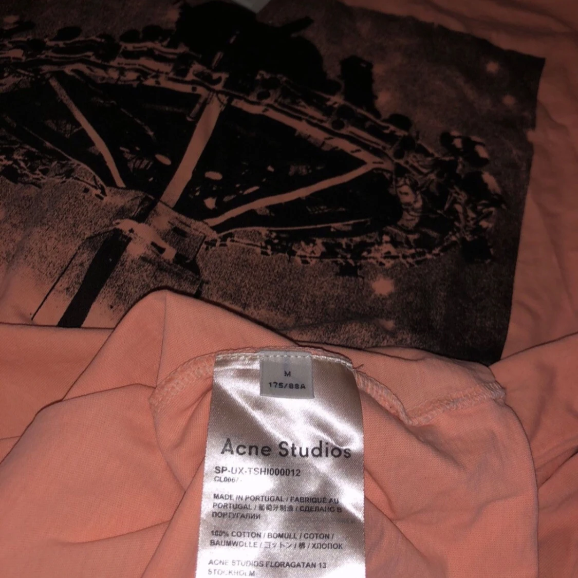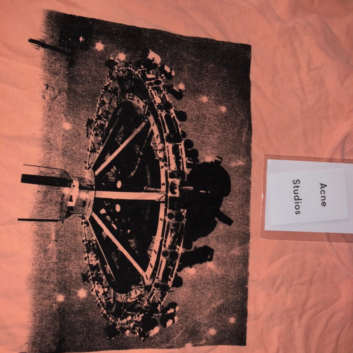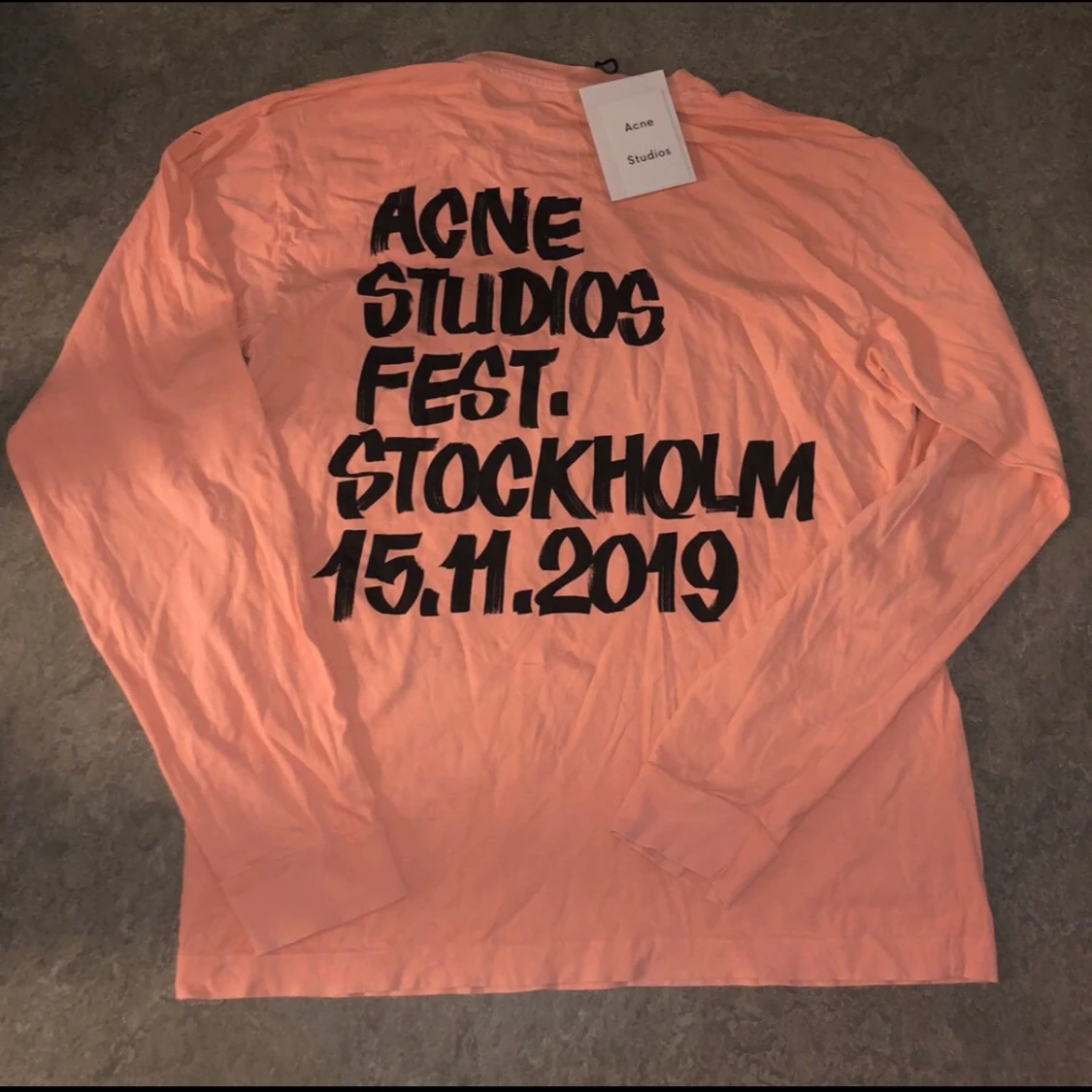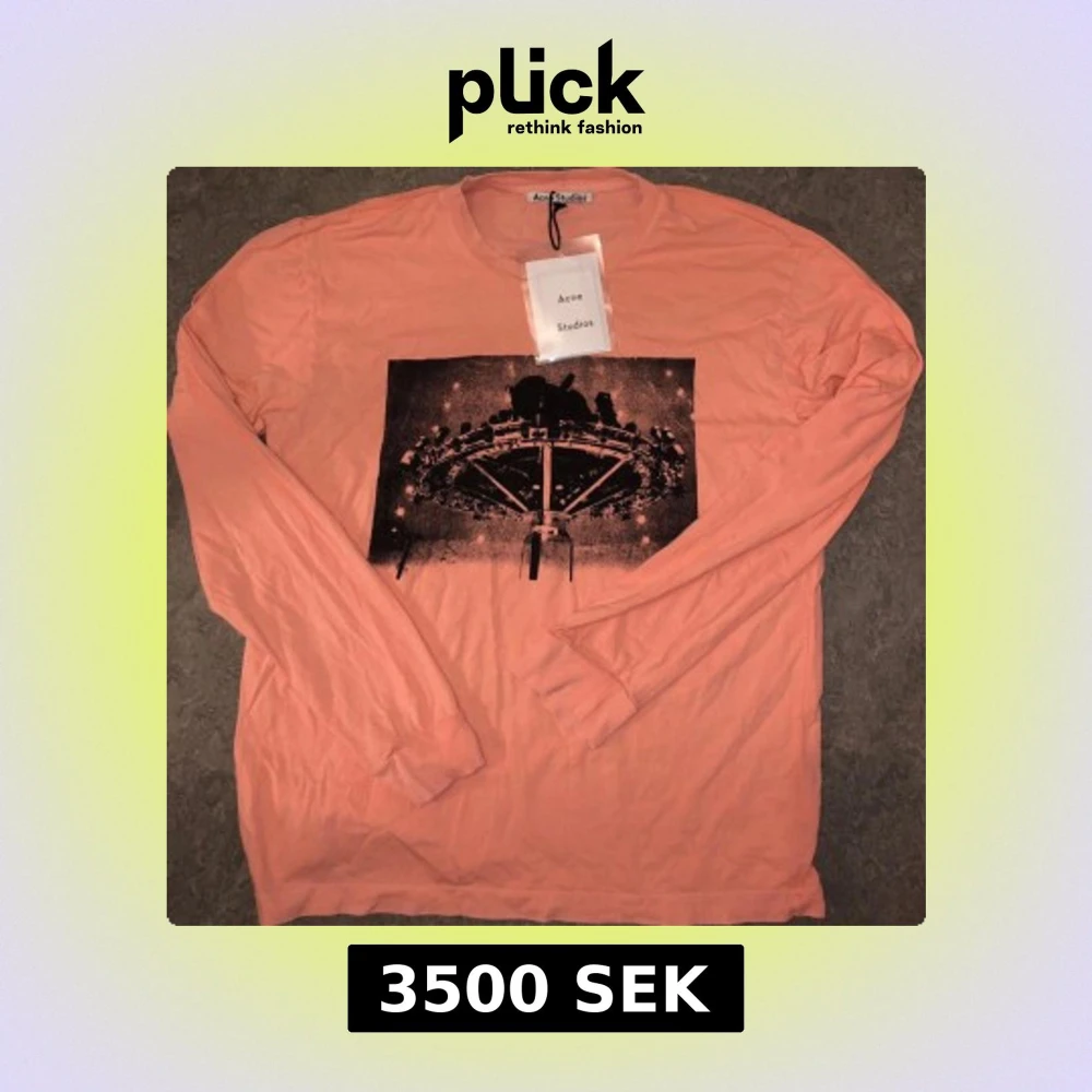 Limited edition långärmad tröja från Acne Studios i ljusrosa bomull. Framsidan har ett stort svart tryck av ett nöjesfältsmotiv och baksidan har fet text med 'Acne Studios Fest. Stockholm 15.11.2019'. Perfekt statement piece för dig som gillar unika plagg. 📏 Ungefärliga mått (i cm): • Bröstvidd (armhåla till armhåla): ~57 cm • Längd (från axel till fåll): ~70 cm • Ärmlängd (från krage): ~76 cm • Axelbredd: Raglanskärning