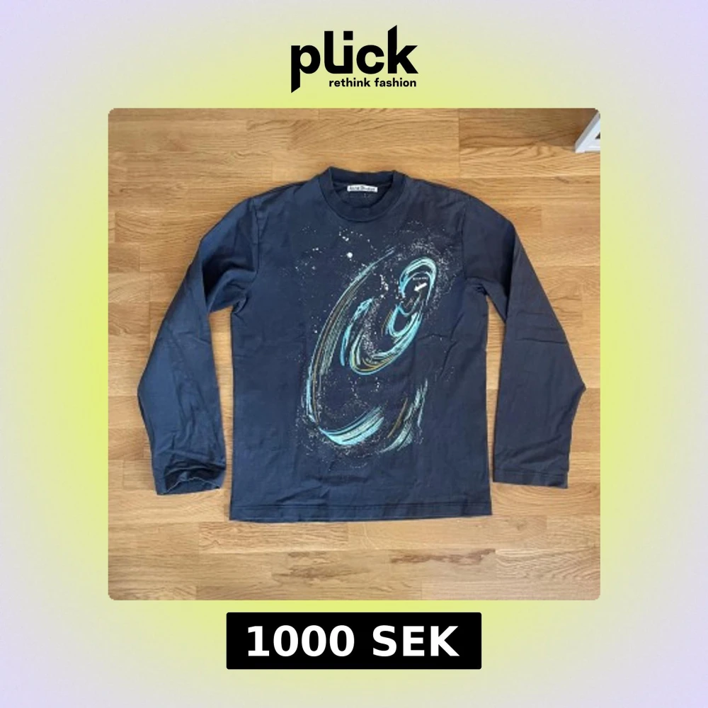 En tjockare grå/blå aktig acne studios long sleeve. Svart hål tryck som lyser lite mörkret. Storlek xs men passar bra s-m då den är oversized. Bra skick och bra kvalitet