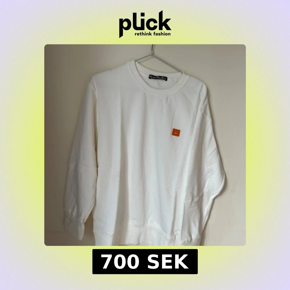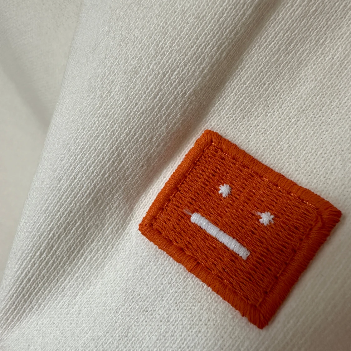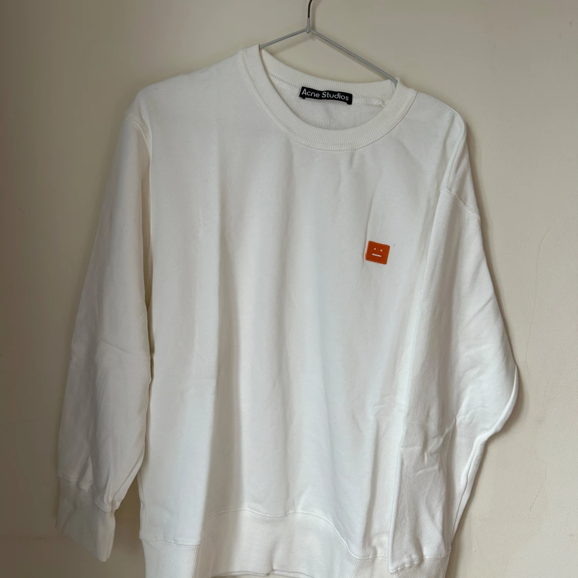 Vit sweatshirt från Acne Studios med klassisk rund hals och lång ärm. På bröstet sitter den ikoniska orangea broderade face-patchen. Tröjan har en loose passform och är tillverkad i mjuk bomull som är skön mot huden.