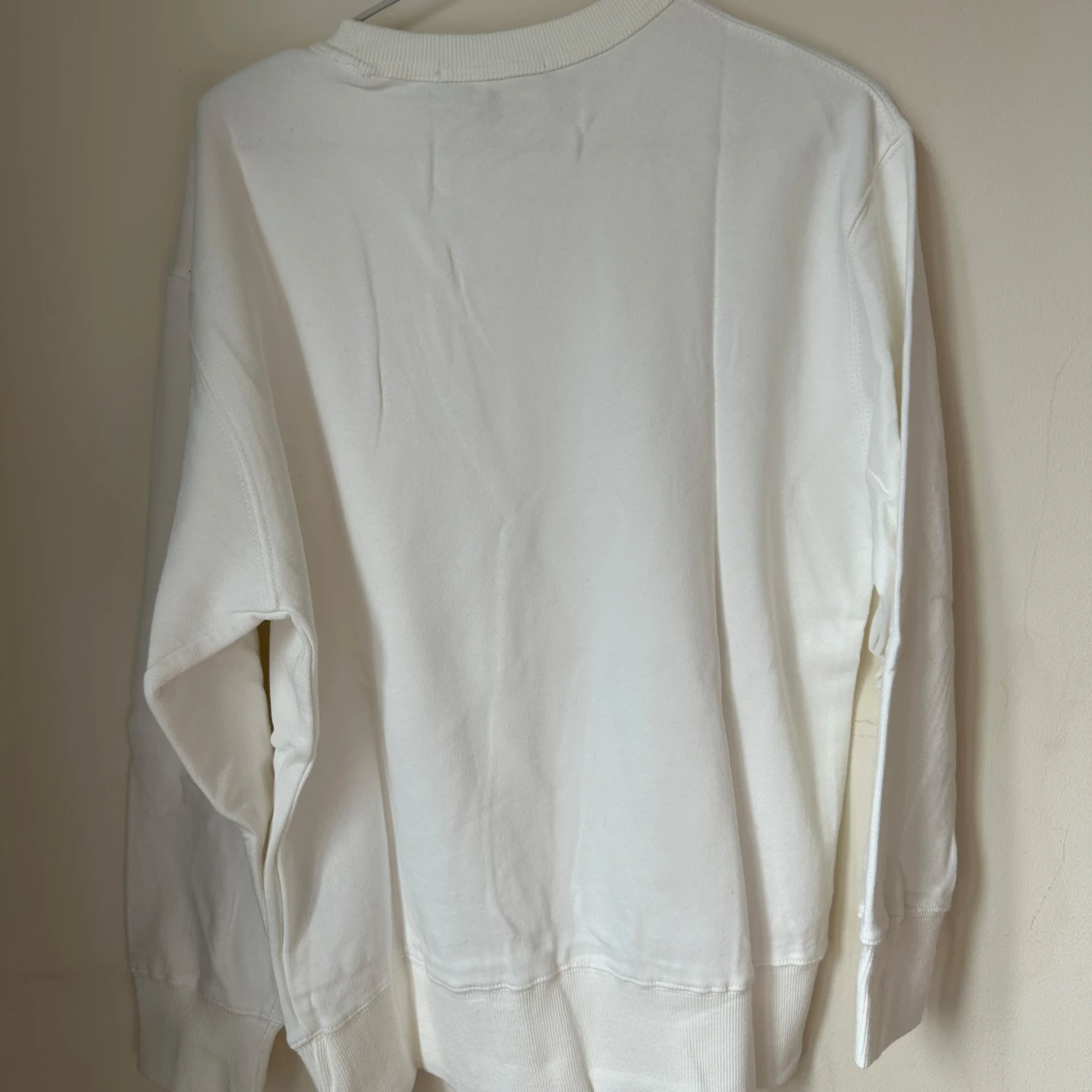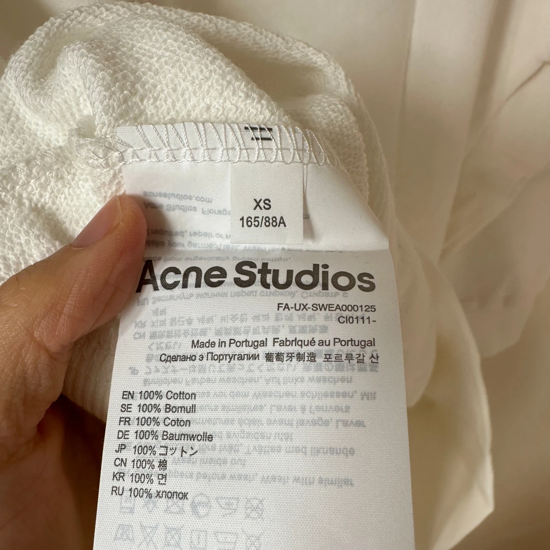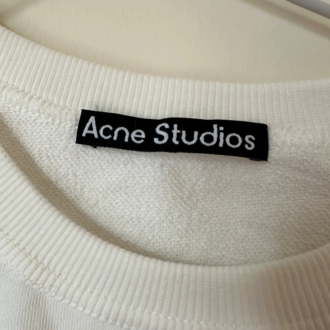 Vit sweatshirt från Acne Studios med klassisk rund hals och lång ärm. På bröstet sitter den ikoniska orangea broderade face-patchen. Tröjan har en loose passform och är tillverkad i mjuk bomull som är skön mot huden.