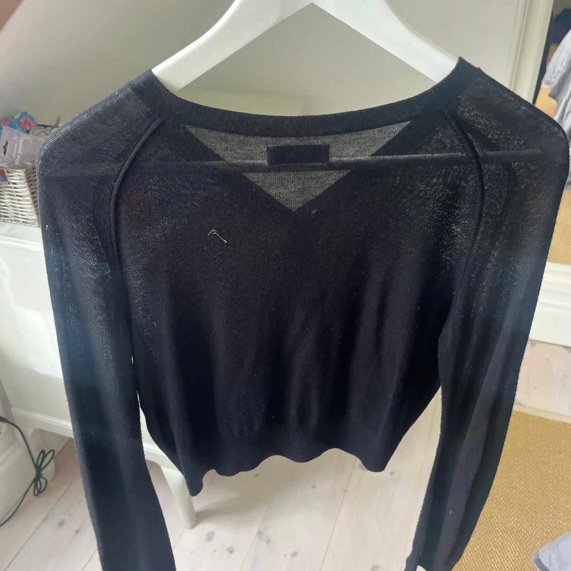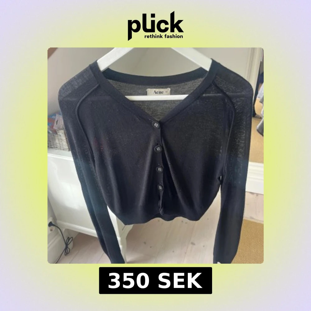 Svart, tunn och stilren kofta från Acne i storlek XS. Koftan har v-ringning, knappar framtill och långa ärmar. Materialet är lätt och känns mjukt mot huden, perfekt för lager-på-lager. Enkel att matcha med olika outfits och har en clean vibe.