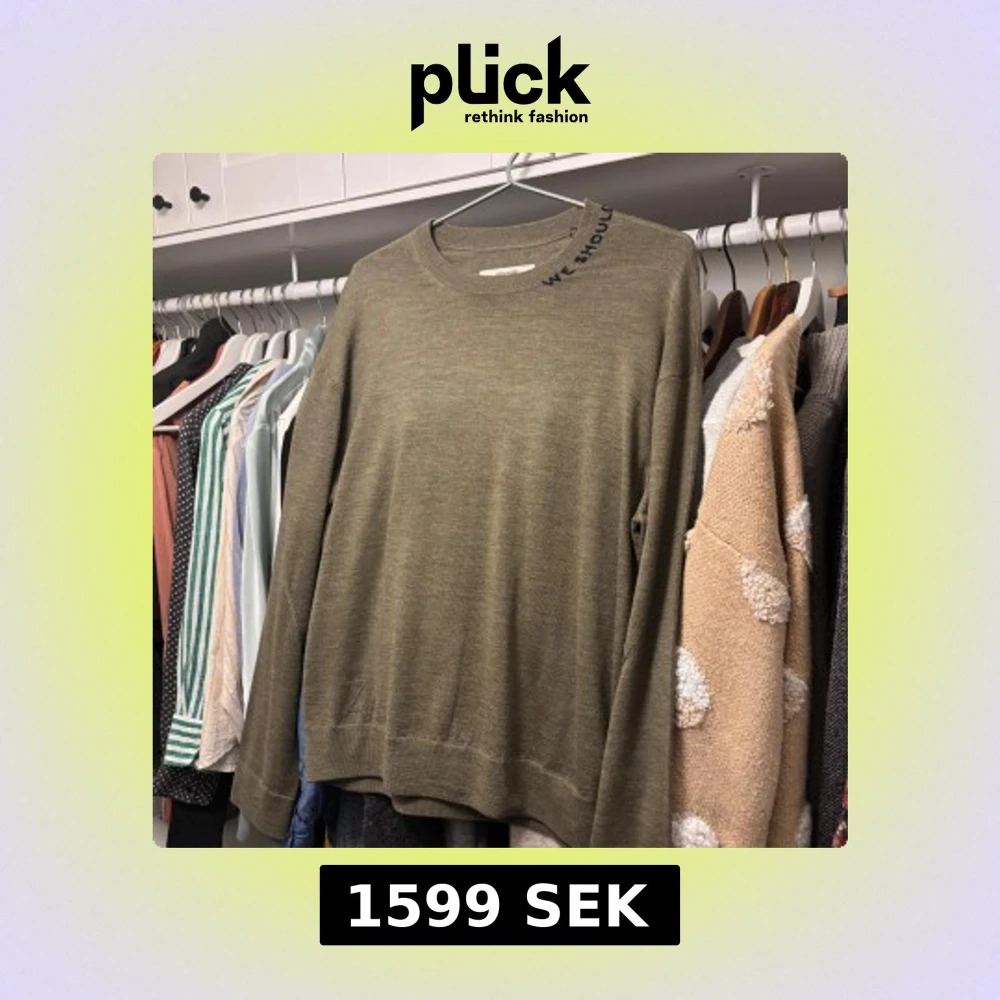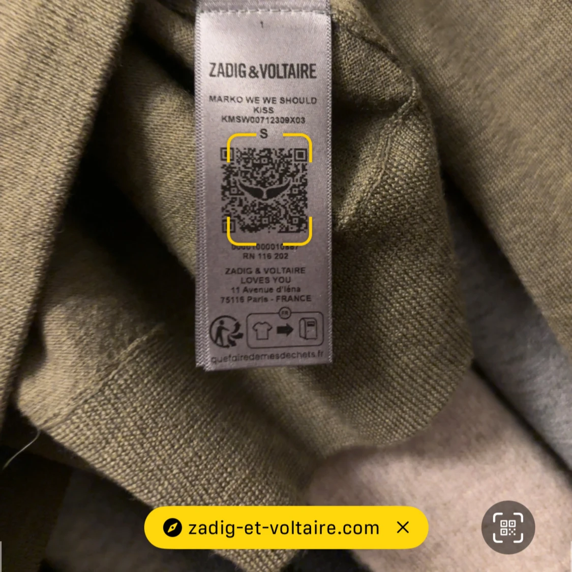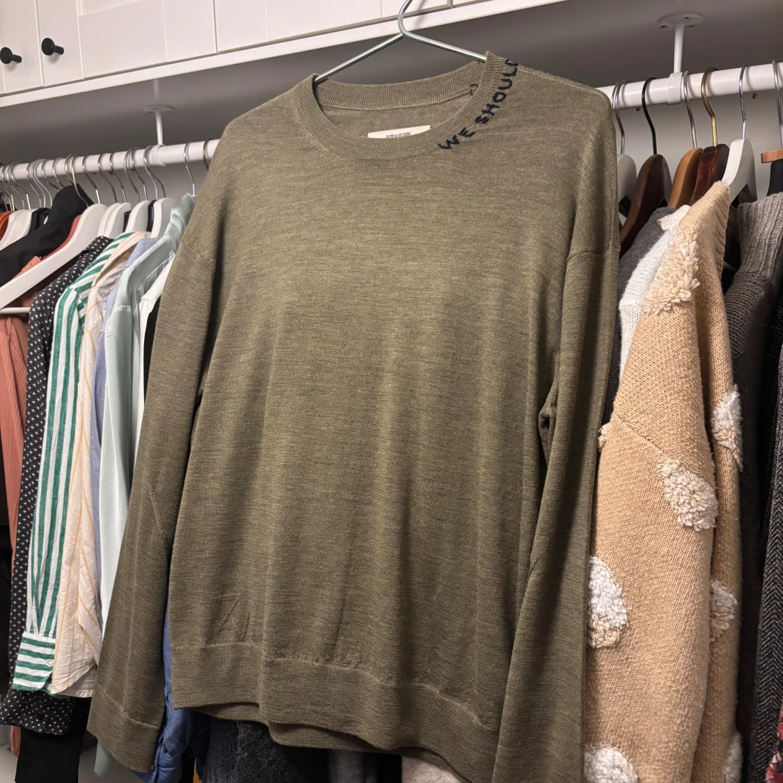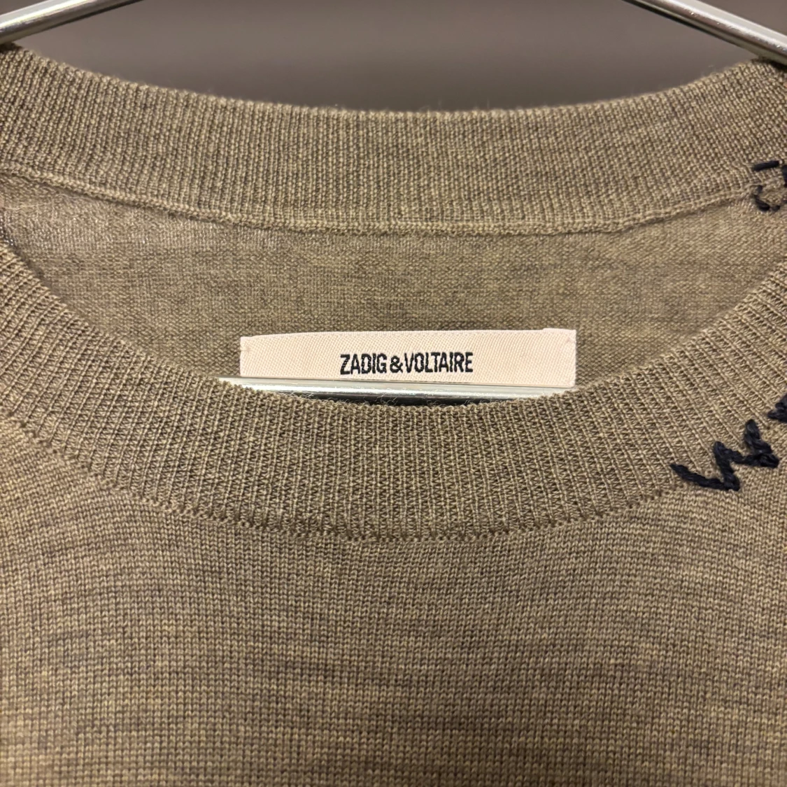 Olivgrön långärmad tröja från Zadig & Voltaire i mjuk ullmix. Rund hals med broderad text 'WE SHOULD KISS' vid kragen som ger en cool detalj. Stilren och enkel design med ribbade muddar och avslappnad passform. Perfekt för dig som gillar minimalistisk vibe. Helt oanvänd, köpt för 4000kr+.