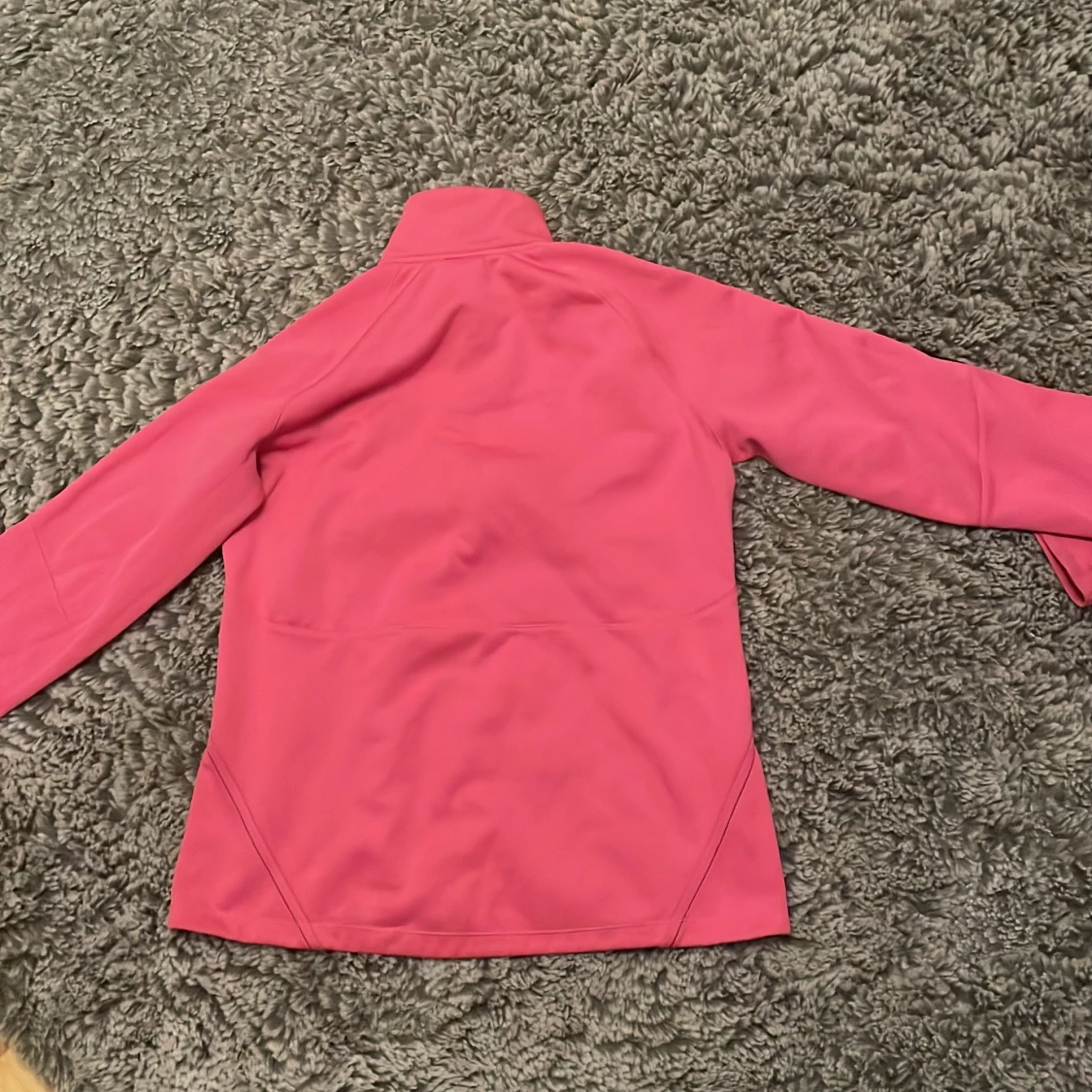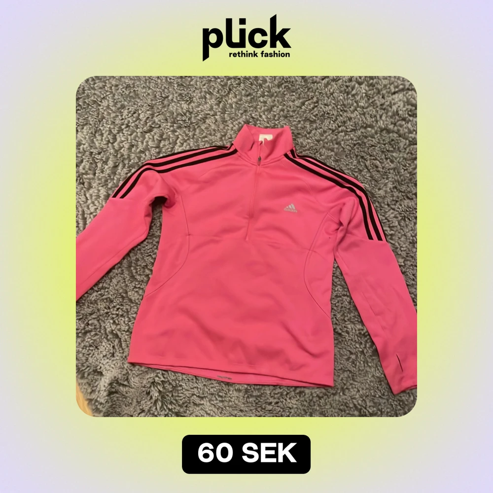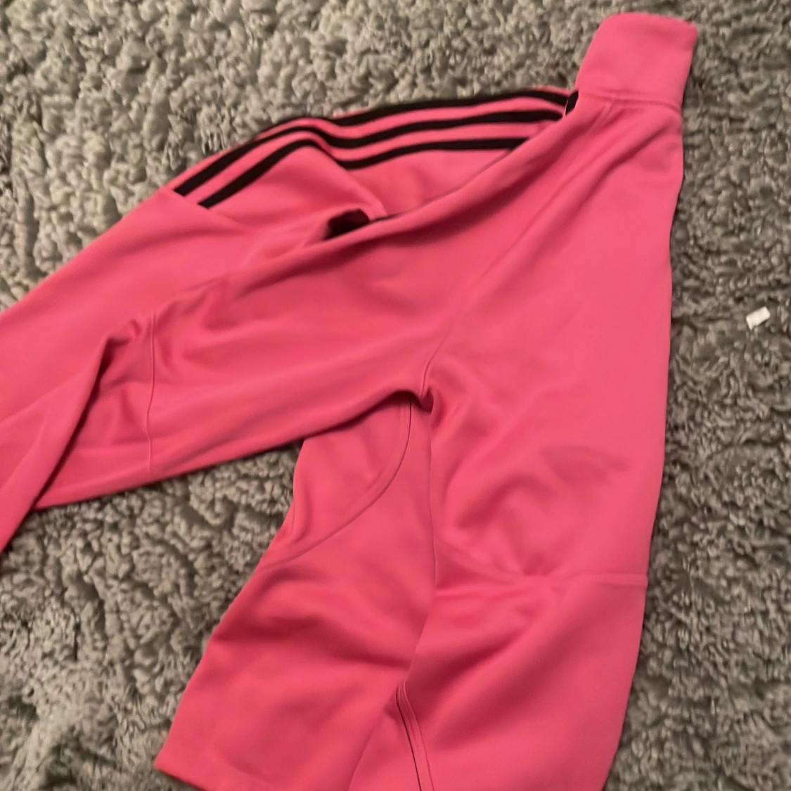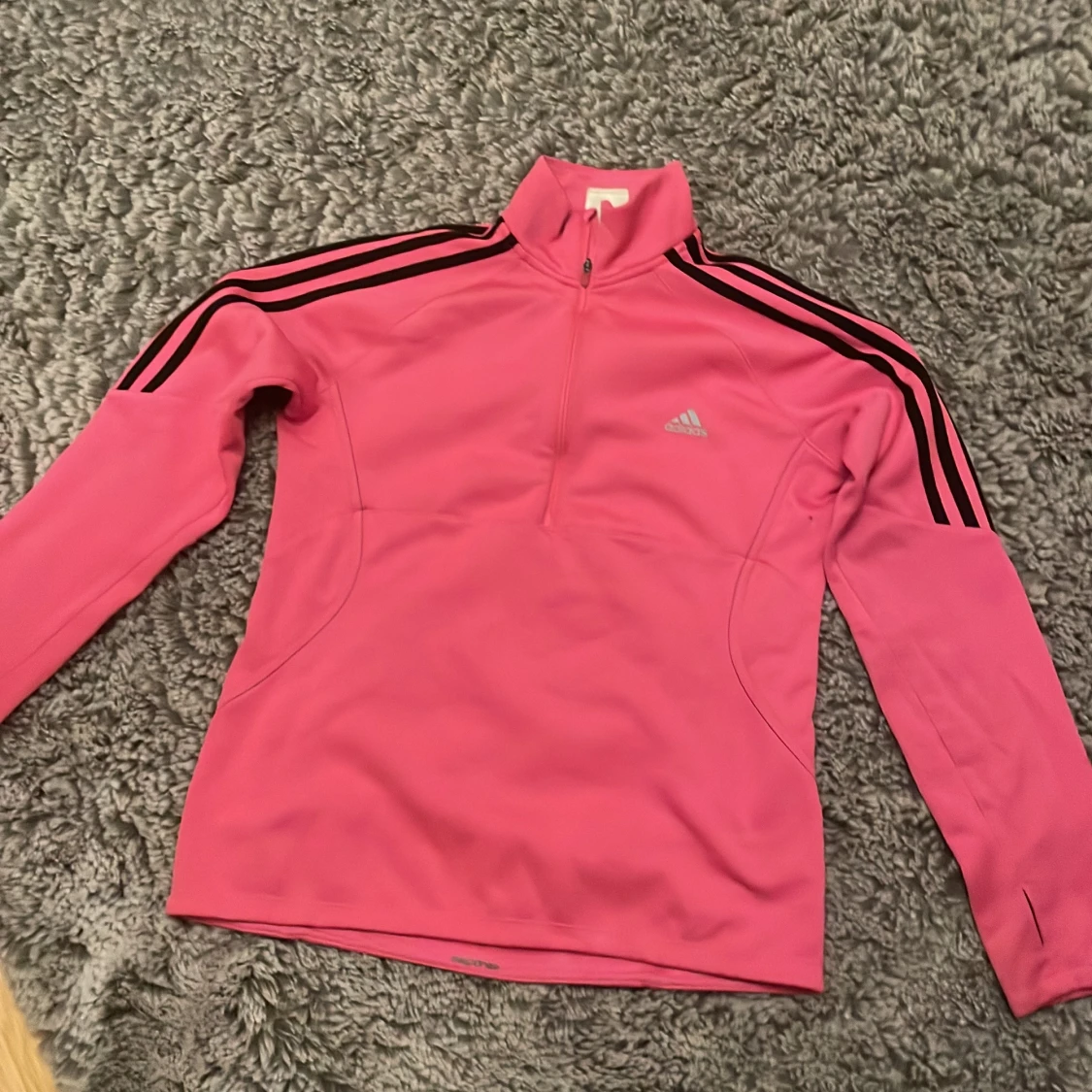 Säljer en snygg rosa träningsjacka från Adidas med svarta ränder på ärmarna. Jackan har en halv dragkedja framtill och är perfekt för träning eller vardagsbruk. Den är i mycket bra skick och har en bekväm passform. Perfekt för höst och vår!