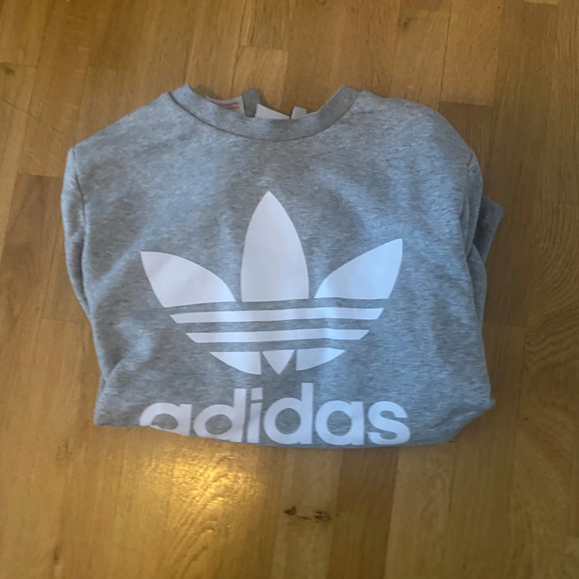 Säljer en grå sweatshirt från Adidas med det klassiska trefoil-logotypen i vitt på framsidan. Tröjan har en rund hals och är perfekt för en avslappnad stil. Passar bra till både jeans och träningsbyxor. 158. 40kr. Priset går att diskuteras