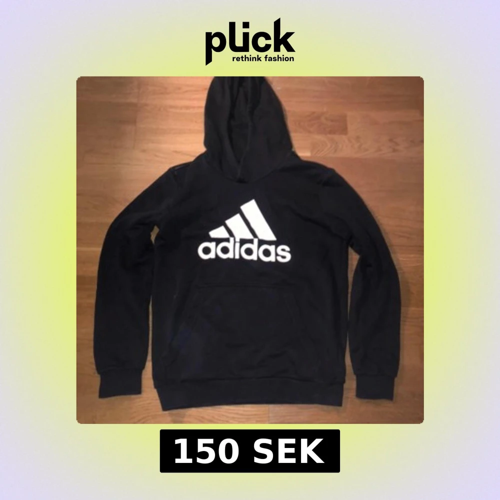 Svart hoodie från Adidas med stor vit logga på bröstet. Klassisk känguruficka framtill, huva och långa ärmar. Perfekt för en sportig och avslappnad stil. Aldrig använd!!!