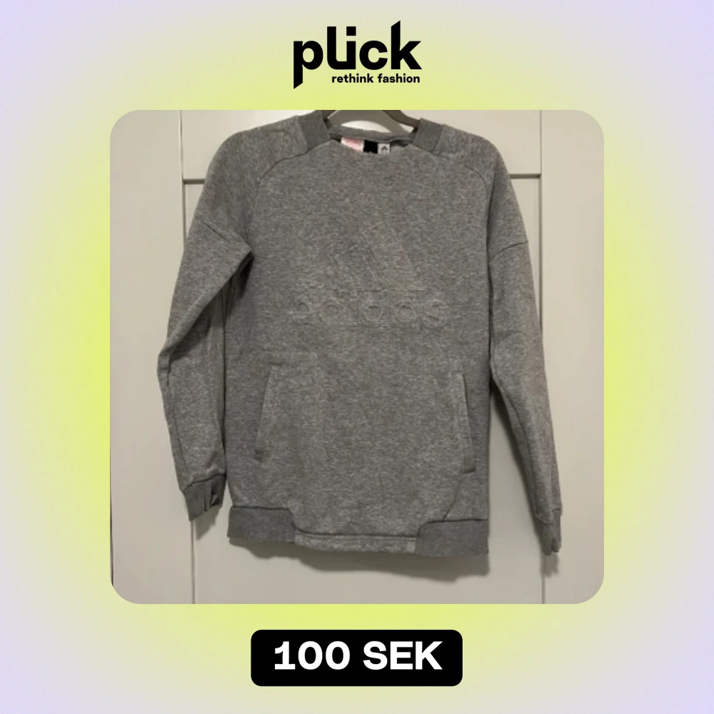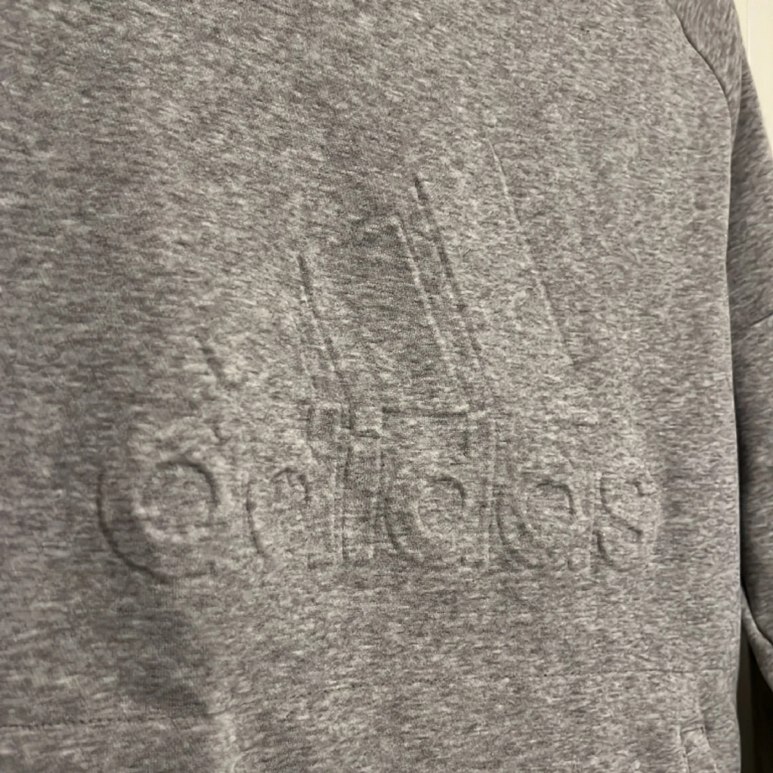 Gråmelerad collegetröja från Adidas. Ficka på mage, präglat tryck på bröstet och svart adidasmärke vid nacke. Storlek 164/13-14 år (något större i storlek).
