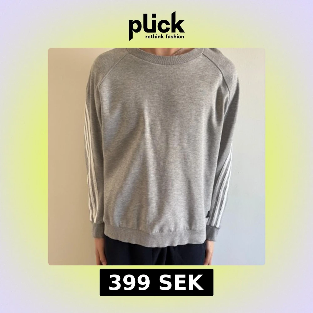 Säljer en grå sweatshirt från Adidas med klassiska vita ränder längs ärmarna och över ryggen. Tröjan har rund halsringning och ribbade muddar vid ärmslut och nederkant. Perfekt för en sportig och avslappnad stil. Skriv kring information😀!