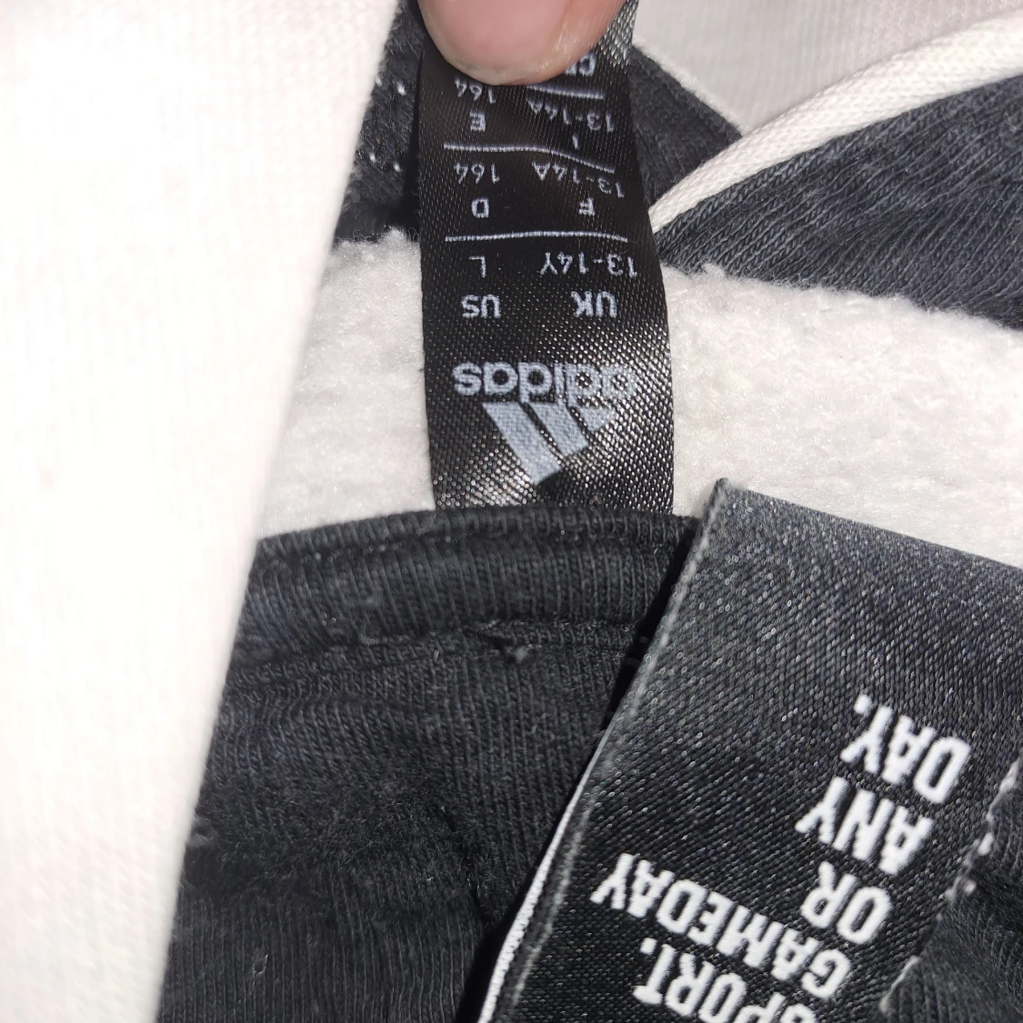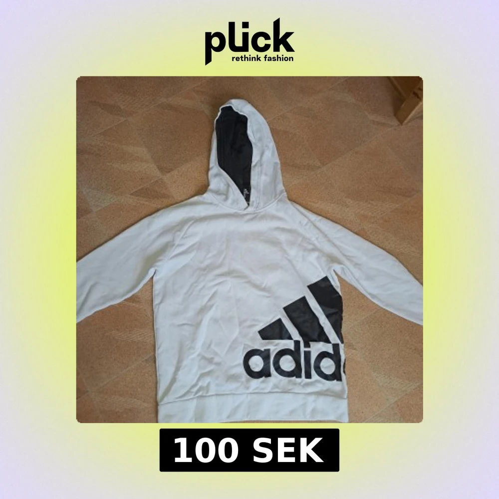 Säljer en vit hoodie från Adidas med stor svart logga och ikoniska ränder på framsidan. Tröjan har huva med svart insida och långa ärmar. Perfekt för dig som gillar sportig och avslappnad stil.