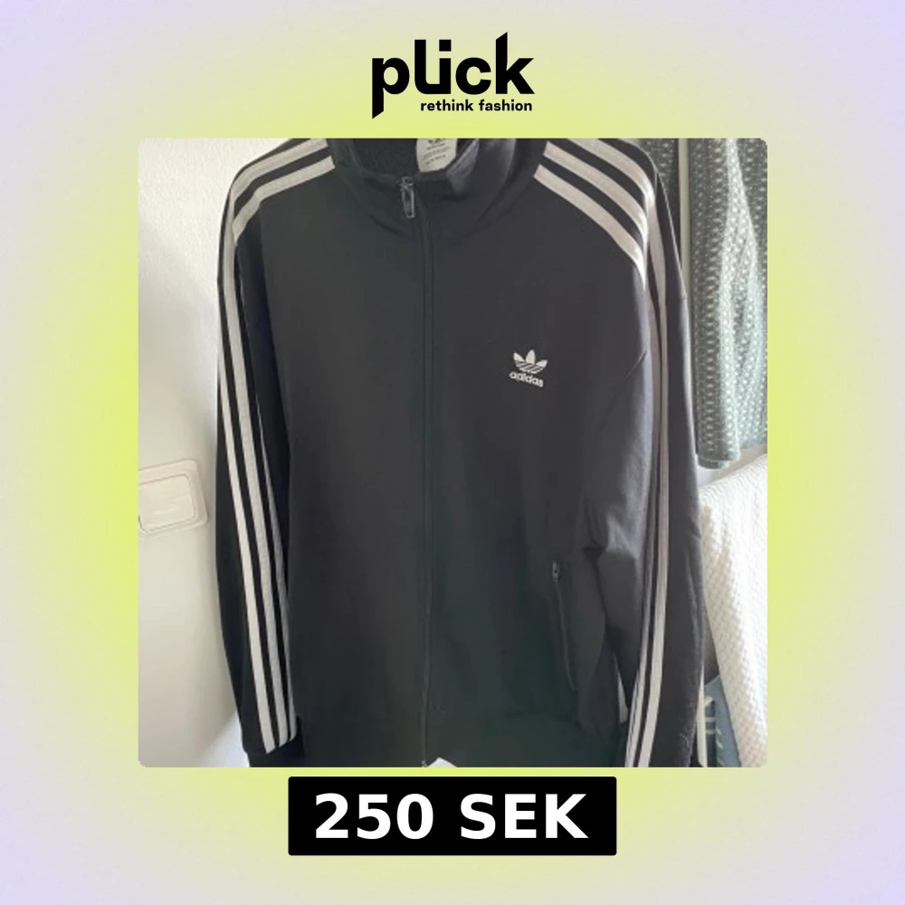 Säljer en svart träningsjacka från Adidas med de klassiska tre vita ränderna längs ärmarna. Jackan har dragkedja framtill och en liten Adidas-logga på bröstet. Perfekt för träning eller en sportig look.