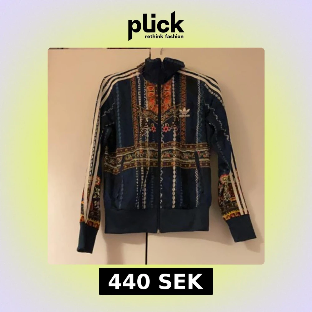 Säljer en unik hoodie från Adidas med färgstarkt mönster i blått, rött och gult. Klassiska vita ränder längs ärmarna, dragkedja framtill och hög krage. Perfekt statement-plagg för dig som vill sticka ut.