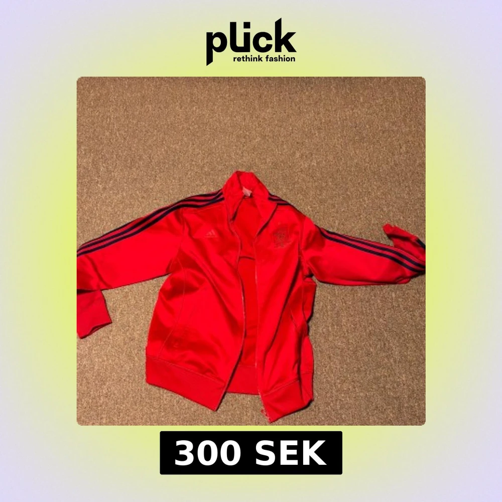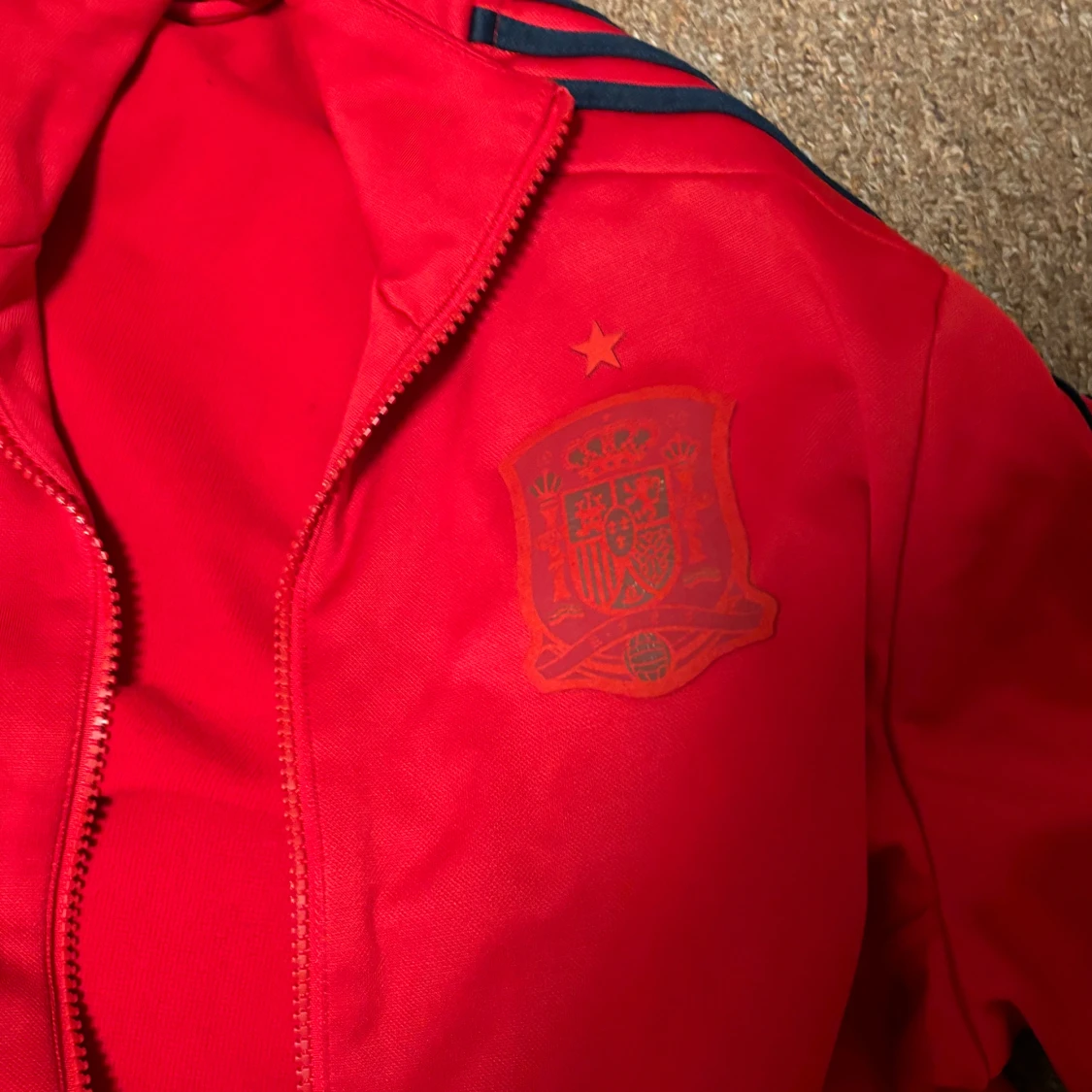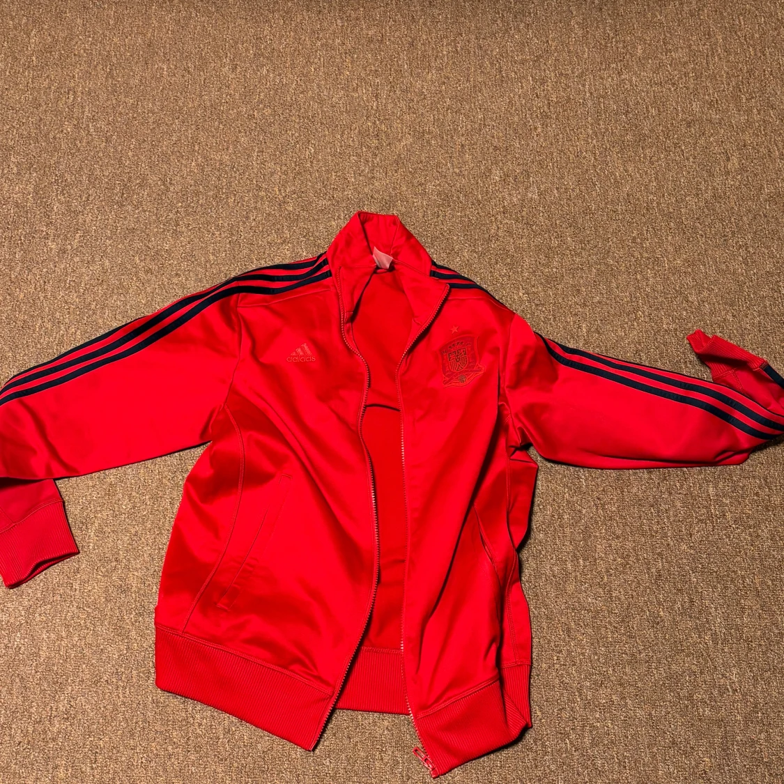 Snygg röd träningsjacka från Adidas med Spanien logga och blå ränder längs ärmarna e Jackan har dragkedja och ribbade muddar. Perfekt för sportiga aktiviteter.